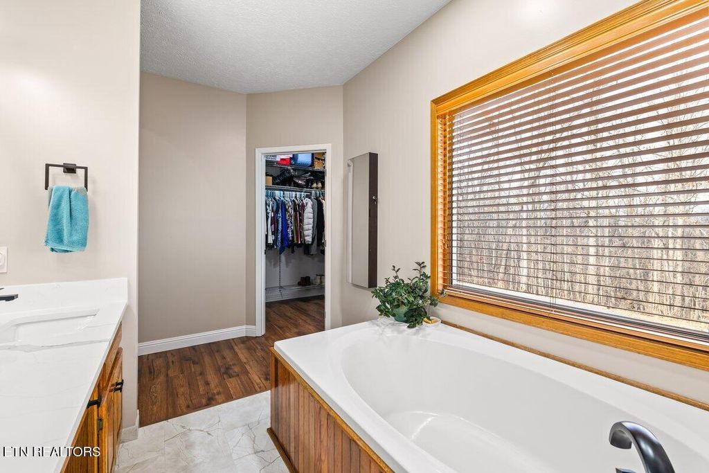The primary bedroom suite features mountain views, a wood tray ceiling, and a spacious en-suite bath with soaking tub, separate shower, updated countertops, and a large walk-in closet. Additional bedrooms and a full bath are located just off the foyer, offering privacy from the primary suite.
