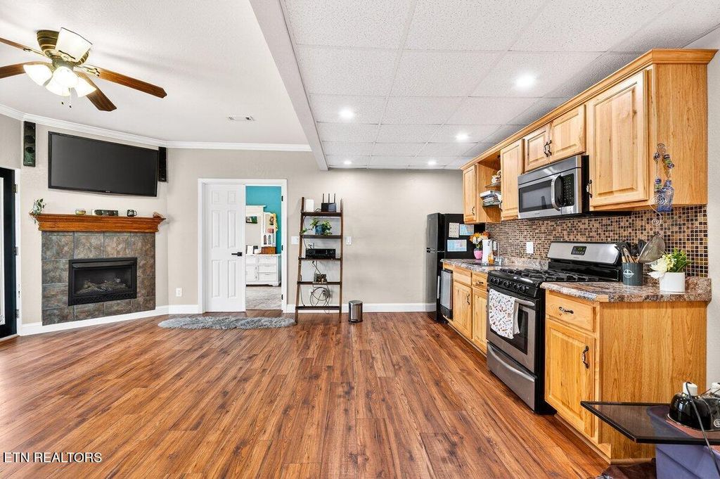 An updated kitchen welcomes you with quartz countertops, stainless appliances, and generous workspace, making it ideal for cooking, entertaining, and enjoying the open-concept layout.