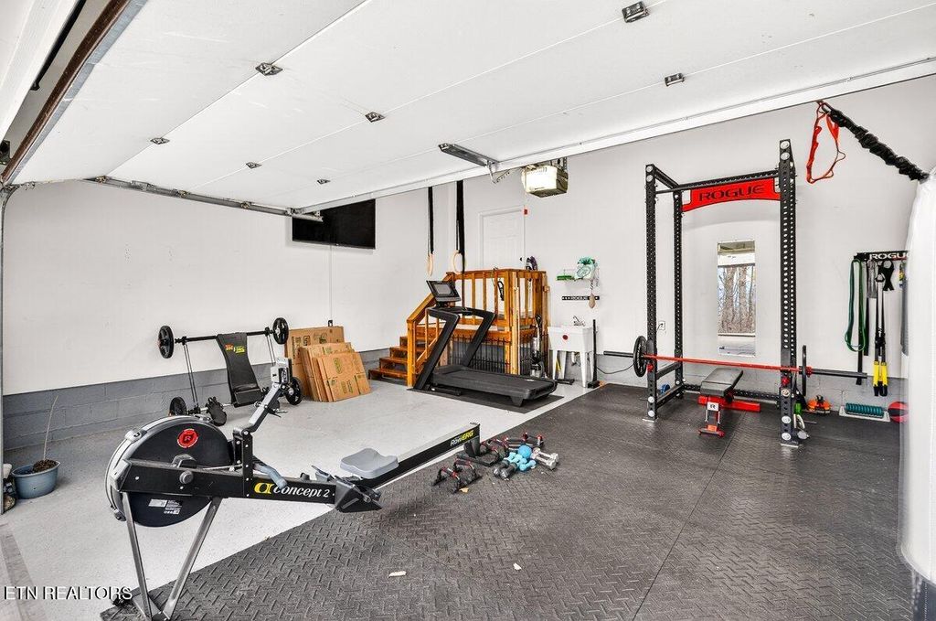 The lower level offers flexible living space, including a second kitchen with gas range, patio access, an additional bedroom, office space, and a small garage. The upper two-car garage is currently configured as a home gym with commercial-grade equipment, and the property also includes an additional single-car garage.