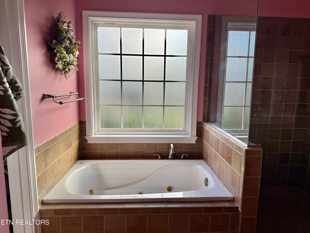 The main-level primary suite includes a beautifully tiled walk-in shower and relaxing Jacuzzi tub, while tile flooring in the kitchen and baths provides durability and style.