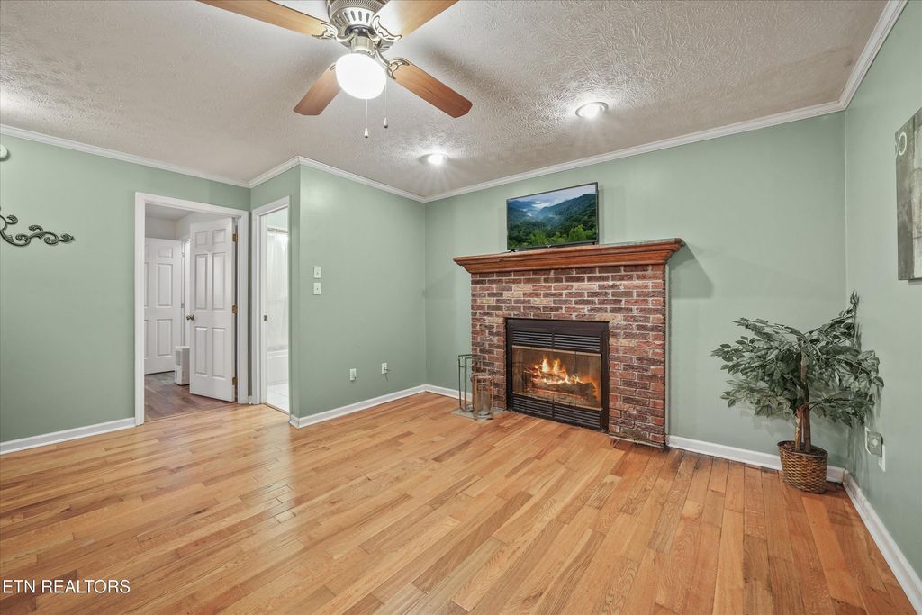 This inviting home welcomes you with a charming covered front porch, perfect for morning coffee or relaxing in the evenings. Inside, you'll find hardwood floors, spacious living areas, and a beautiful brick gas fireplace perfect for cozy evenings.