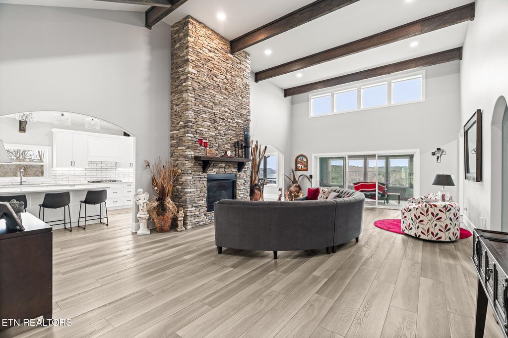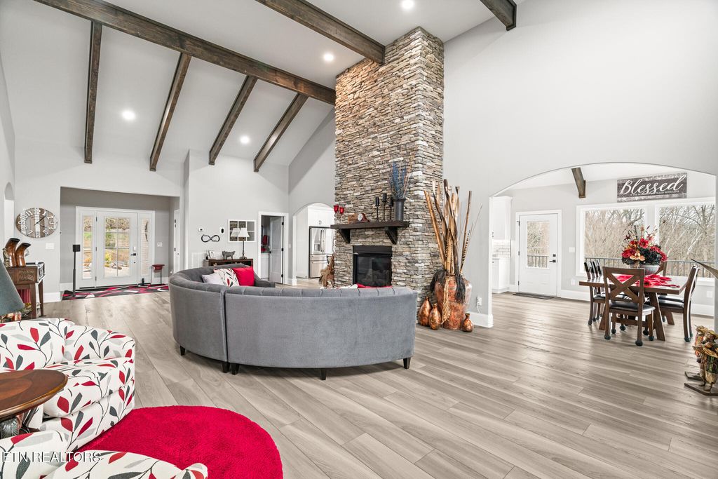 Step inside to discover an inviting open floor plan filled with natural light, perfect for both everyday living and entertaining. The main living area features soaring ceilings, elegant finishes, and seamless flow into the kitchen and dining spaces, along with a beautiful fireplace. The **well-appointed kitchen** offers ample cabinetry, generous counter space, and a layout designed for gatherings and functionality.