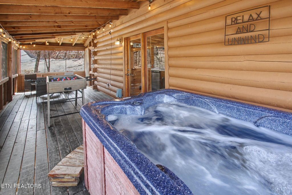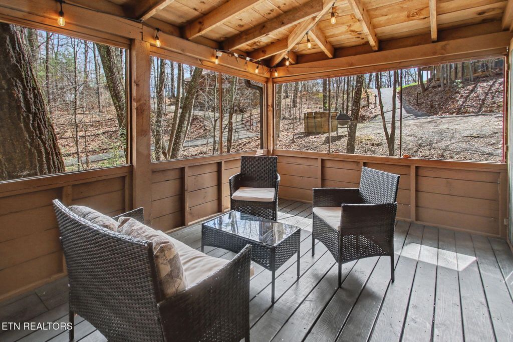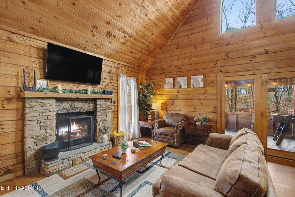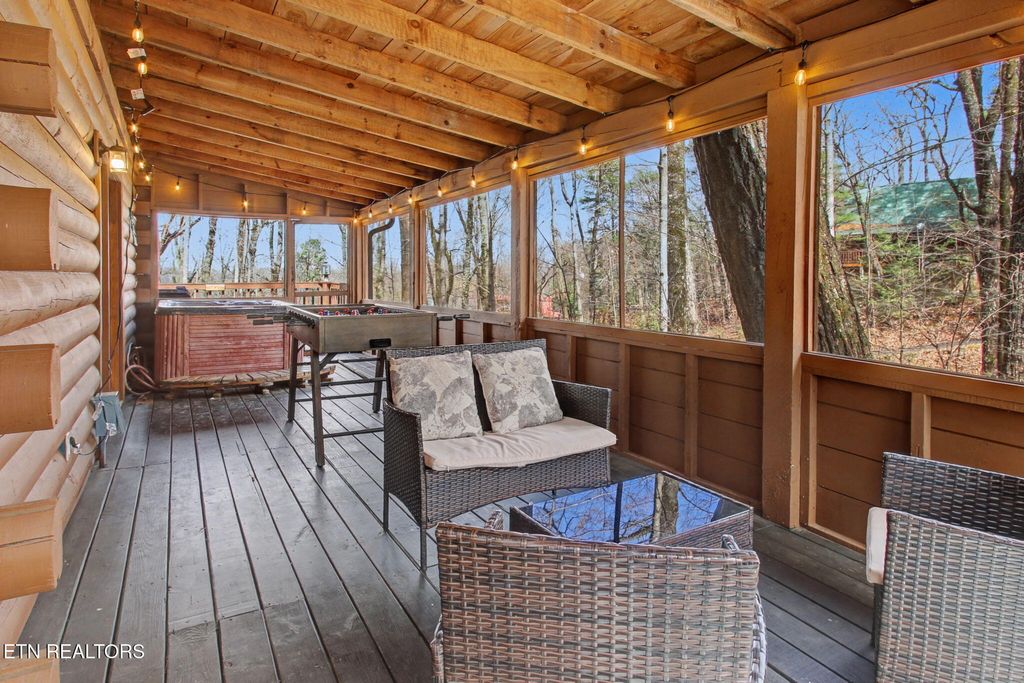 Charming cabin nestled on a wooded lot, perfectly situated just 15 minutes from Gatlinburg, Pigeon Forge, Dollywood, and Great Smoky Mountains National Park. The living area features stunning A-Frame ceilings with walls of windows that bathe the space in natural light and give you the feeling of being among the treetops. This 2BD/2BA retreat includes a cozy electric fireplace, foosball table, and queen sleeper sofa -- plus a fully stocked kitchen with seating for 6. The upstairs king suite includes a private balcony and en-suite bath, while the downstairs queen bedroom features a multicade arcade system and soaking tub. Enjoy the outdoors year-round on the wrap-around deck, screened-in porch with hot tub, and charcoal grill. With $36,000 in scheduled 2026 bookings already secured, this turnkey short-term rental is ready to generate income from day one.