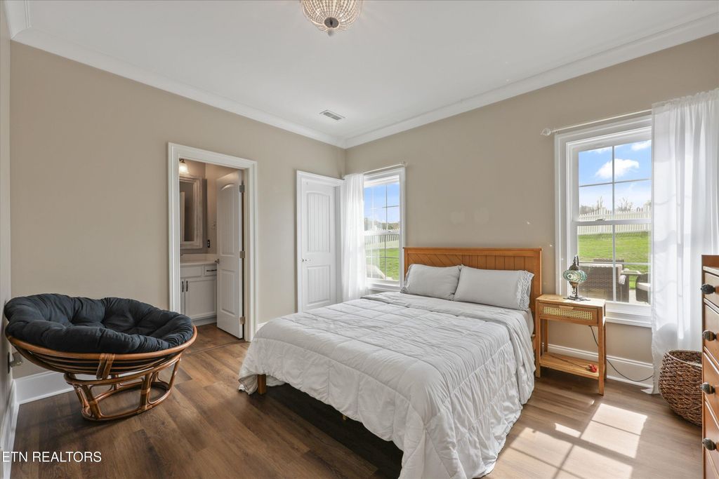 The thoughtfully designed layout includes a primary suite on the main level with a private ensuite bathroom, along with an additional main-level bedroom that also features its own ensuite bath--ideal for guests or multigenerational living. Upstairs, you'll find a private guest retreat with its own living area and bathroom, a loft area with panoramic lake views, plus a versatile bonus room over the garage equipped with its own mini-split unit, perfect for a home office, media room, or workout space.