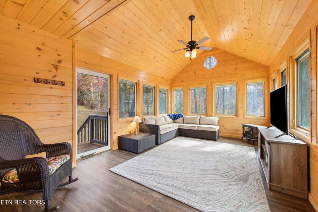 In addition to the lving and entertaining areas the main floor has two very large bedrooms and stylish bath. On a cooler morning or evening relax in the spacious 3 season room with tongue and groove cathedral ceiling.