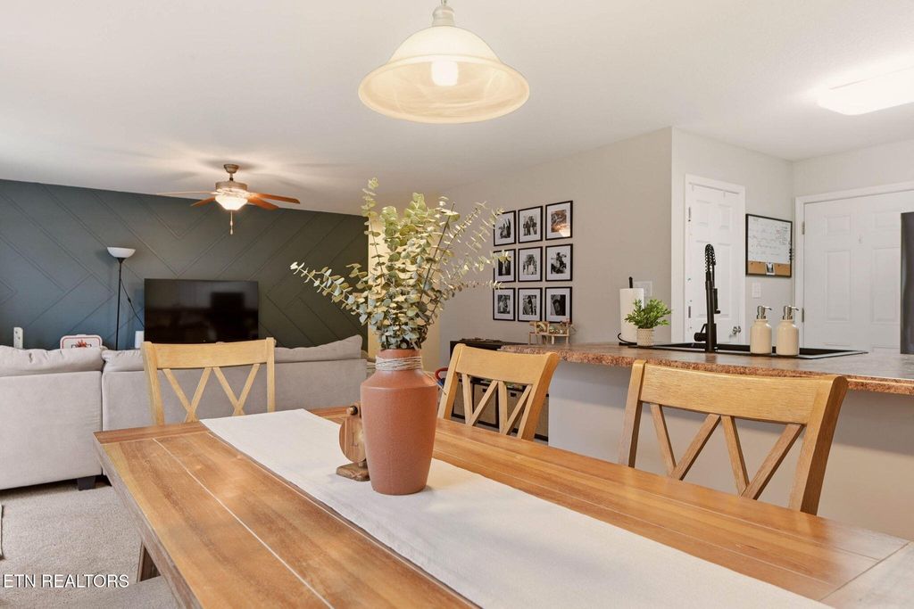Inside, the open floor plan creates an inviting atmosphere, where a trendy accent wall sets the stage in the spacious living room and flows seamlessly into the kitchen and dining area. The kitchen is a chef's delight, complete with a large pantry, abundant counter space, ample cabinetry, and a stylish new farmhouse sink. The bar area offers the perfect serving space for the dining room, making everyday living and entertaining easy. Just steps away, the patio and fenced backyard are conveniently located off the kitchen and dining area, ideal for grilling out and enjoying warmer days ahead.