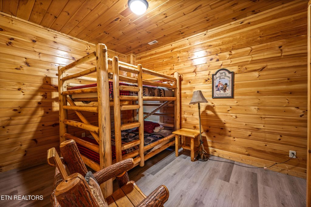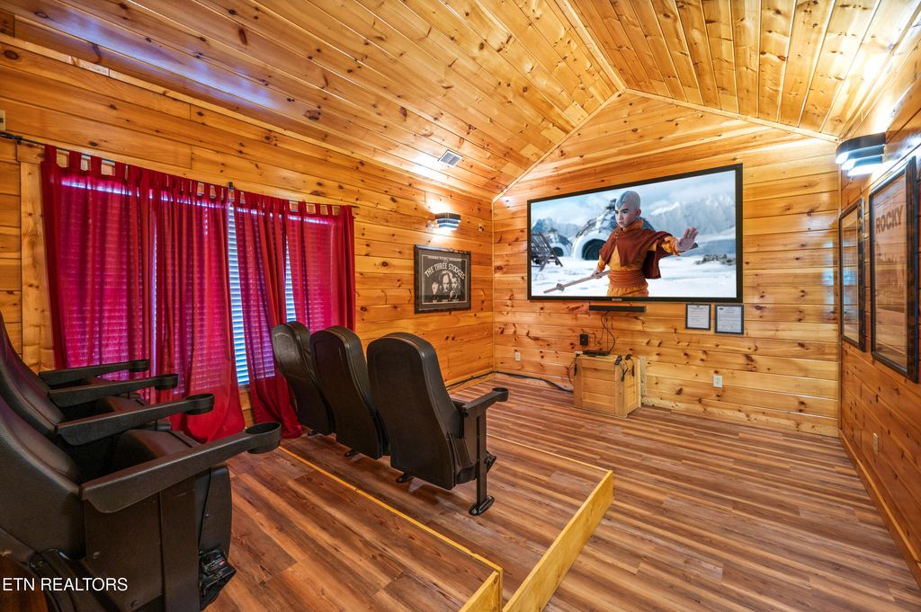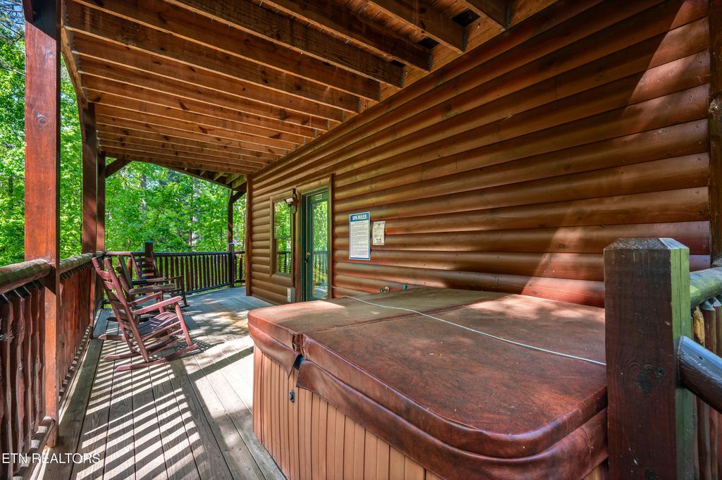 Designed with guest experience in mind, the cabin offers expansive covered decks, a private theater room, hot tub, wet bar, arcade system, and multiple gathering spaces ideal for hosting large groups and maximizing repeat bookings.