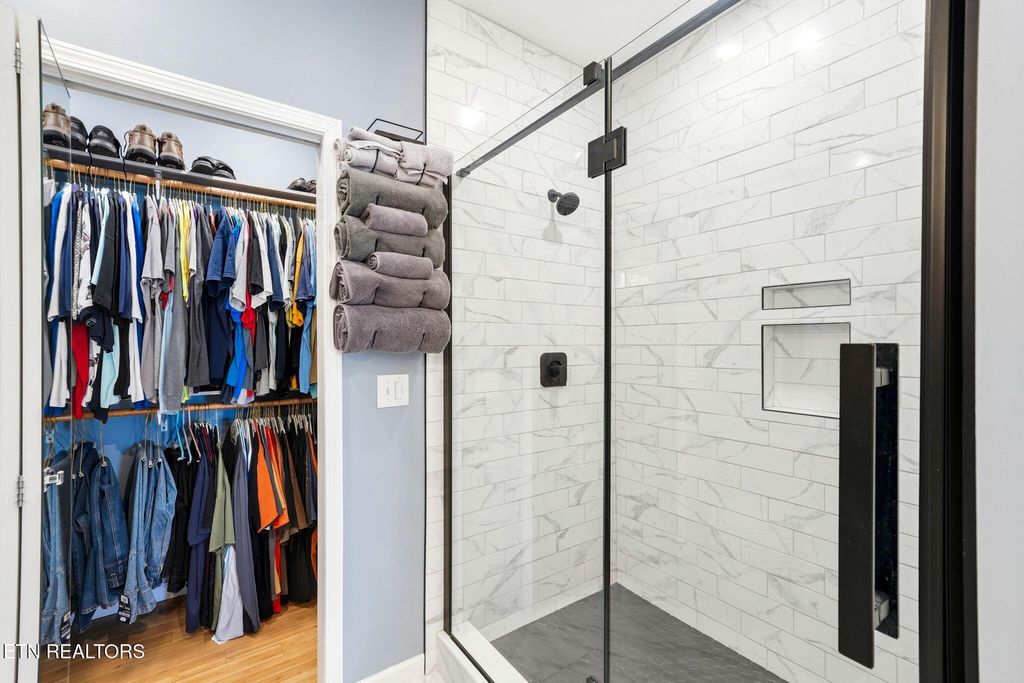 The main level features three spacious bedrooms and two full bathrooms, including a well-appointed primary suite with his-and-hers walk-in closets and a luxurious bathroom complete with heated floors. Plantation shutters throughout the home add timeless elegance, while quartz countertops and a full suite of included kitchen appliances make the kitchen both stylish and move-in ready.