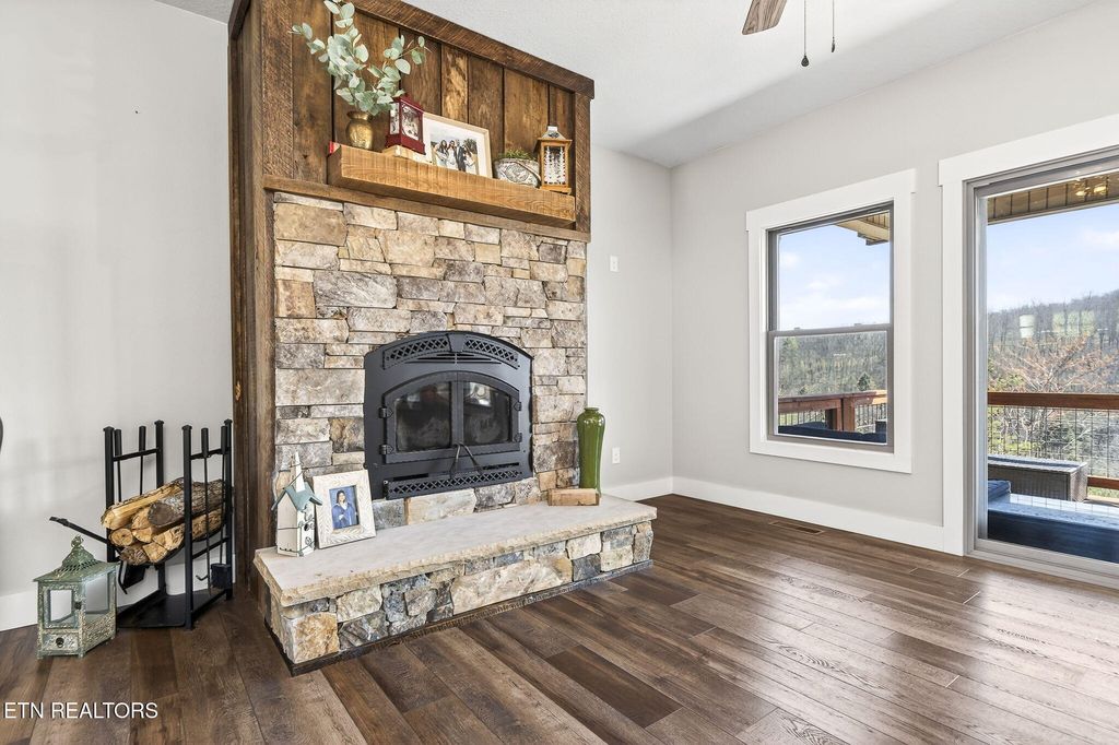 "¢ Spacious main-level living room with a stone fireplace and wood-burning insert