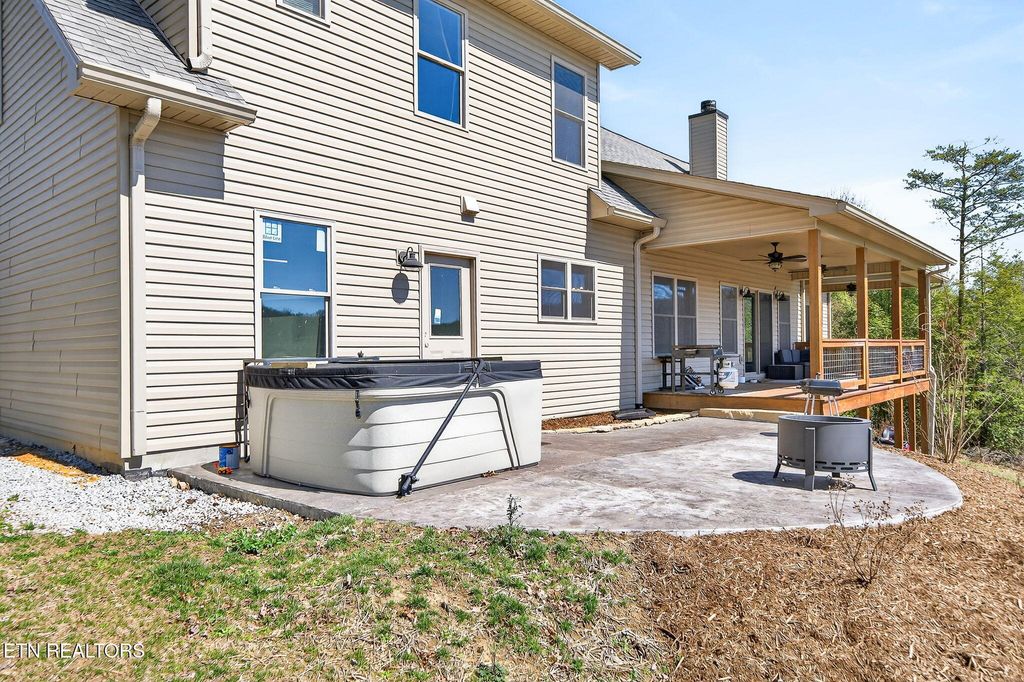 "¢ Covered front porch, stamped concrete sidewalks and patio, and a large covered deck with fans
