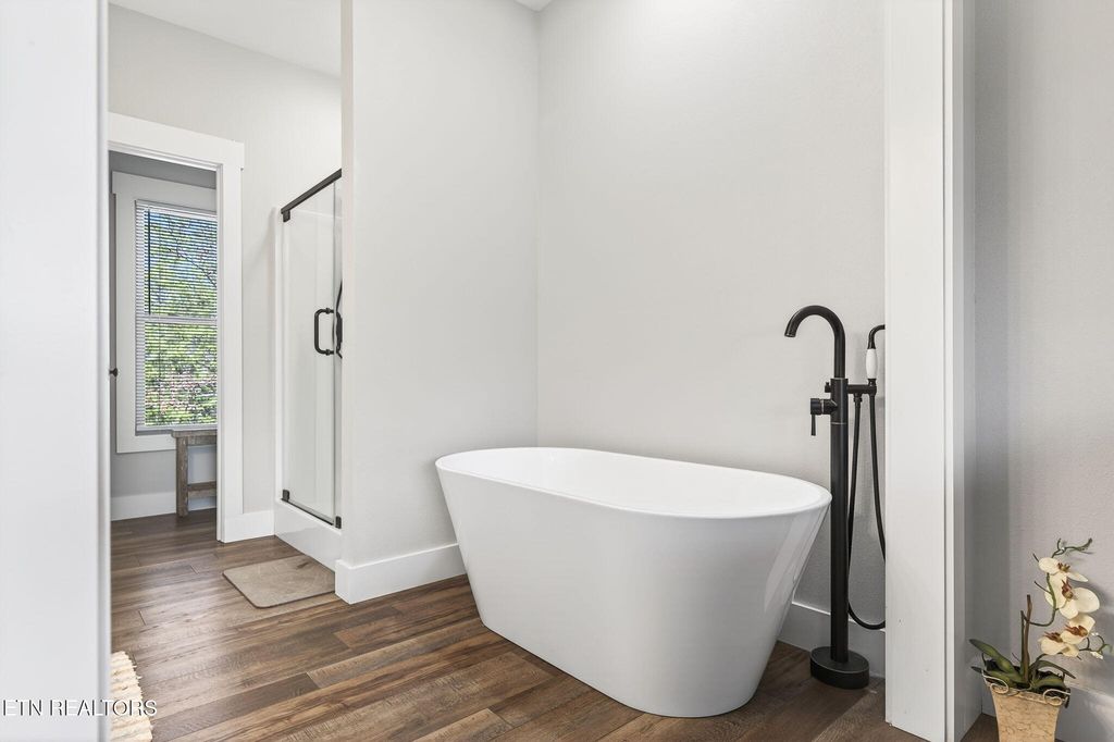 "¢ Main-level primary suite with a private balcony, large walk-in closet, soaker tub, double sink oversized vanity, linen closet, and walk-in shower with glass doors