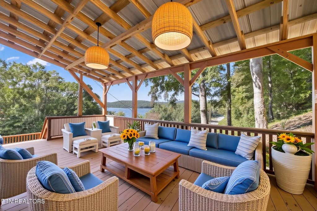 Relax on the expansive covered deck (24ft x 16ft), or soak up the sun on the open deck (400sf). An adjoining 320sf deck room with numerous windows offers versatile uses, whether for a gym, recreation area, or even as a charming sun room for lazy summer days by the lake.