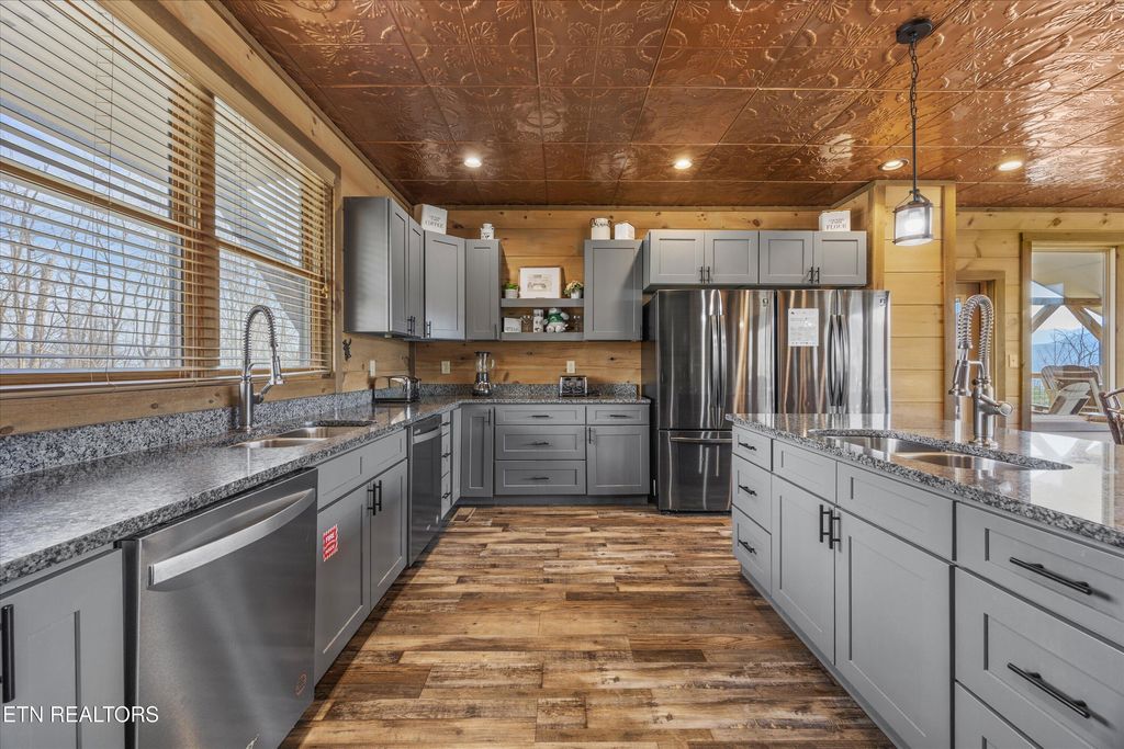 Designed to accommodate up to 20 guests, the cabin features an open-concept layout with expansive windows that showcase breathtaking year-round long-range mountain views. The fully equipped kitchen includes granite countertops, stainless steel appliances, and ample space for hosting large groups.