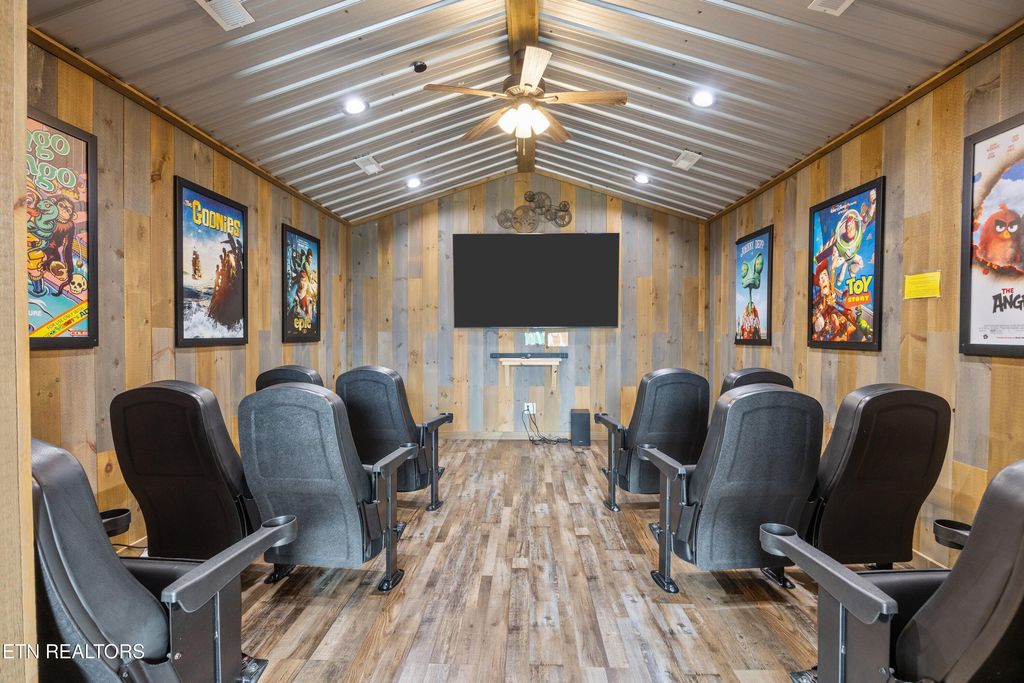 The private theater room offers a true cinematic experience, featuring stylish tin ceilings, custom wall paneling, theater-style seating with cup holders, and a large-screen TV -- perfect for movie nights and guest entertainment.