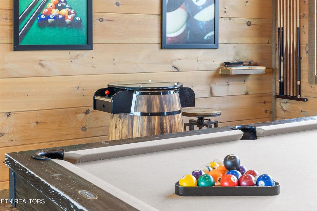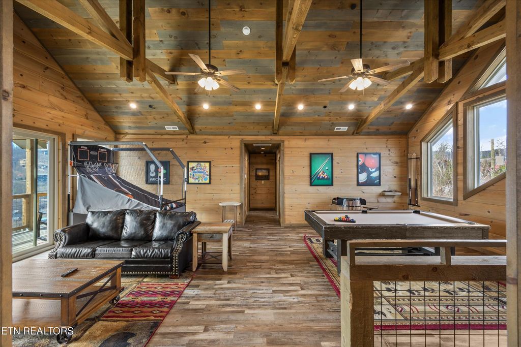 The upper-level open loft / rec area features cathedral ceilings, exposed beams, and large windows showcasing incredible mountain views. Designed for entertainment, this space includes a pool table, arcade basketball game, multi-game arcade unit, and a comfortable TV lounge with sofa -- creating the perfect gathering space for guests of all ages.