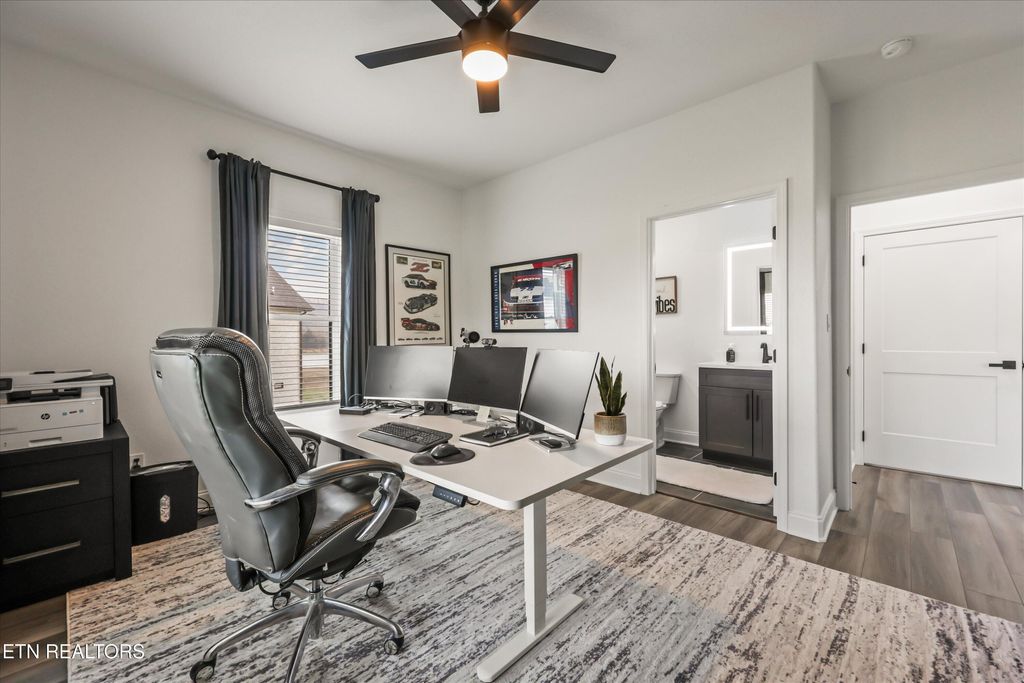 Also on the main floor, there's a junior suite featuring tailored built-ins in the closet. An office with an attached full bathroom. And tying it all together, a stone fireplace that echoes the exterior accents.