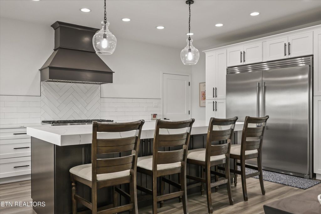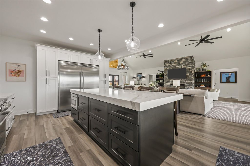 Inside, you will find cathedral ceilings, luxury vinyl plank and tile flooring, quartz countertops throughout, high-end appliances (full-size refrigerator & freezer, 8 burner stove, beverage cooler) and thoughtful details. The kitchen is a true showpiece with a large island featuring a 4-inch quartz reveal that extends into the guest half bath, creating a custom, luxurious feel & beautiful finishes. The primary suite on the main level offers a spa-like retreat with a generously sized soaker tub, which provides extra length and depth for ultimate relaxation, walk-in shower with floor to ceiling tile, the closet is a custom showcase closet with display areas to stylishly feature your favorite items, offering convenient access to the laundry room.