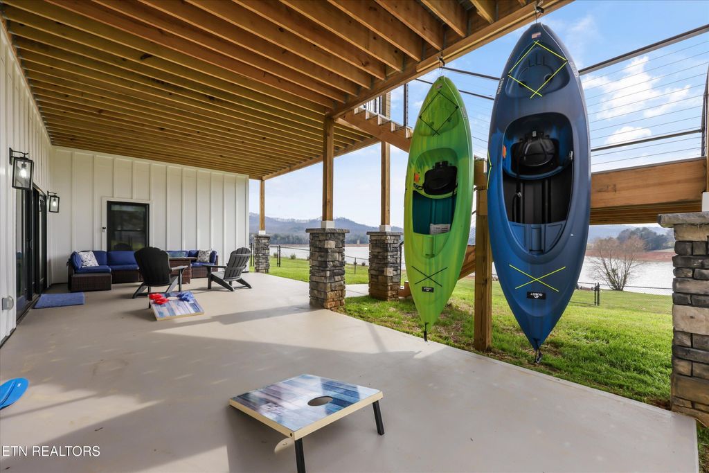Step outside and take in the incredible waterfront setting. Approximately three-quarters of the shoreline has easy walk-in entry and no steep drop-off, making it ideal for enjoying the lake. The large upstairs deck was designed to impress, featuring vaulted ceilings, Anderson sliders, durable high-end decking, and sweeping lake views. A sleek railing ensures those views remain unobstructed. Gas and electrical options are also available on this level. Perfect for relaxing or entertaining. Additional highlights include an oversized 4-car tandem garage, fenced yard, Energy Star windows, Hardie board plank siding with stone accents, and 10-inch thick concrete foundation walls