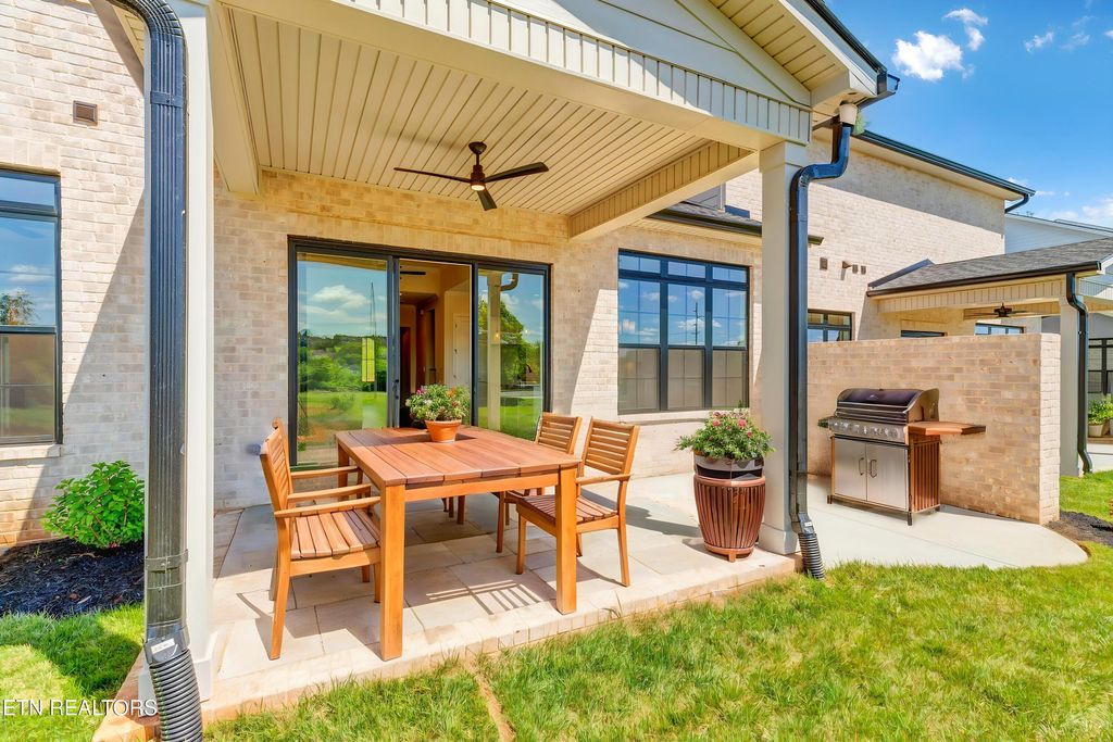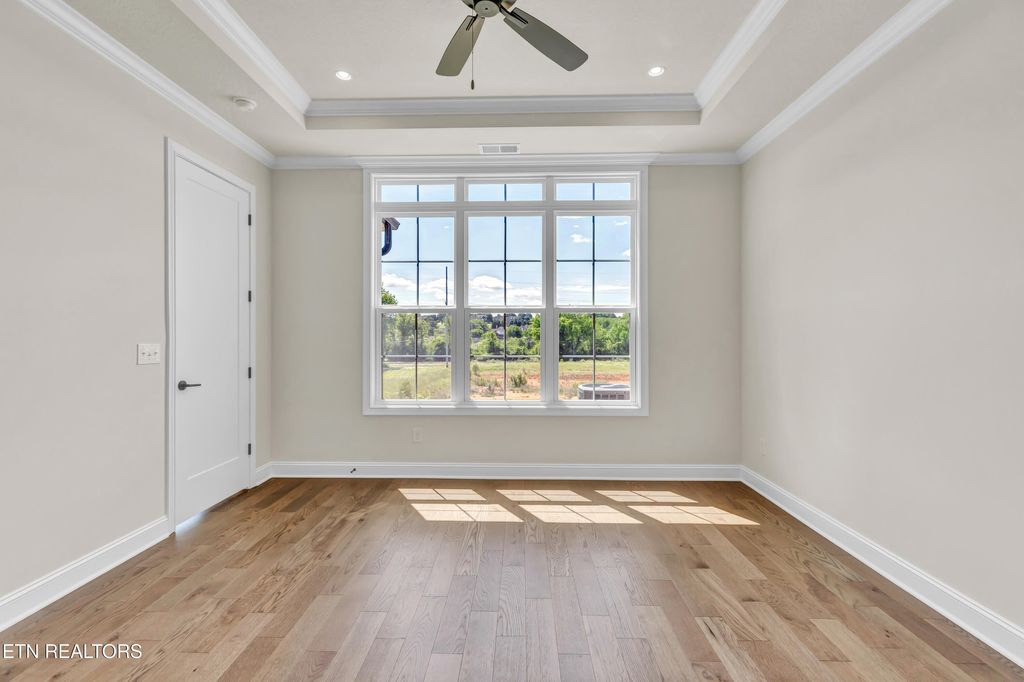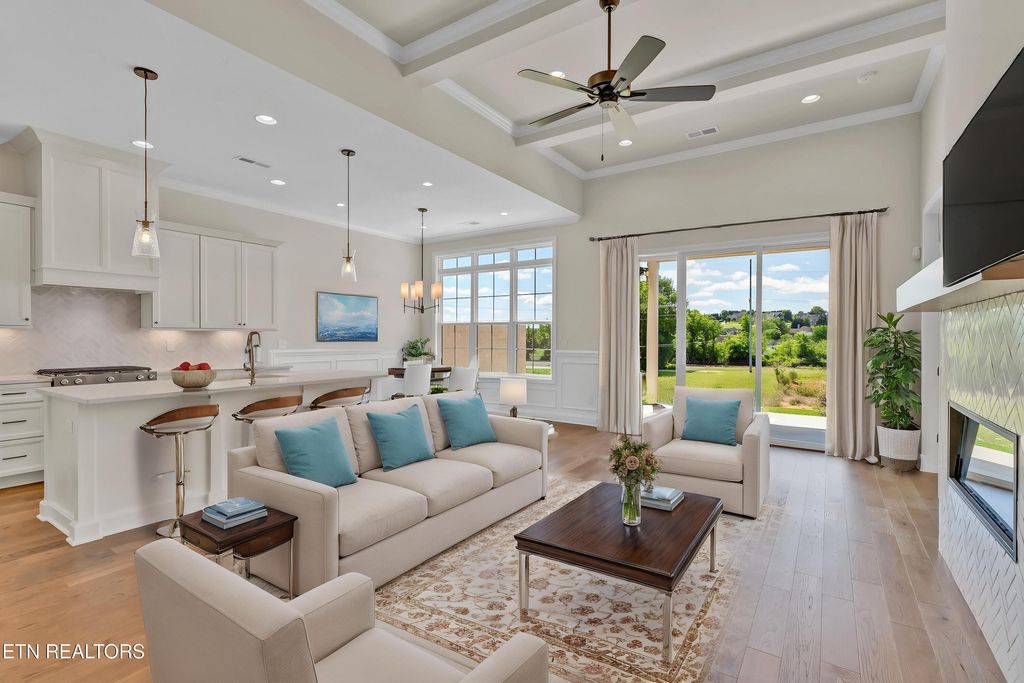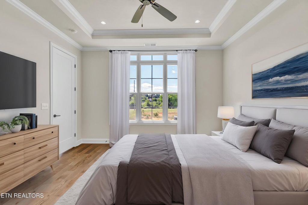Low Maintenance Luxury. Live in style in The Grove at Boyd Station luxury Townhomes. This Townhome has an upscale luxury brick exterior, black exterior windows, 10 ft ceilings on the main floor, hardwood flooring throughout the main level, a primary suite plus an additional bedroom and 2 full bathrooms on the main level along with the laundry room. A sizeable great room with tray ceiling, a linear electric fireplace, gourmet kitchen with quartz countertops, stainless steel appliances and 42 inch painted maple wood cabinetry make this the perfect, low maintenance retreat. Open the glass sliding door in the great room and step out onto the covered rear porch. The owner's bathroom has an enlarged tile shower, double bowl vanity, and a large walk-in closet. Travel up the oak-treaded stairs, and you will find a large bonus room, two additional bedrooms, two full bathrooms, and a floored storage area. Schedule your showing for this beautiful townhome today. You will not be disappointed.