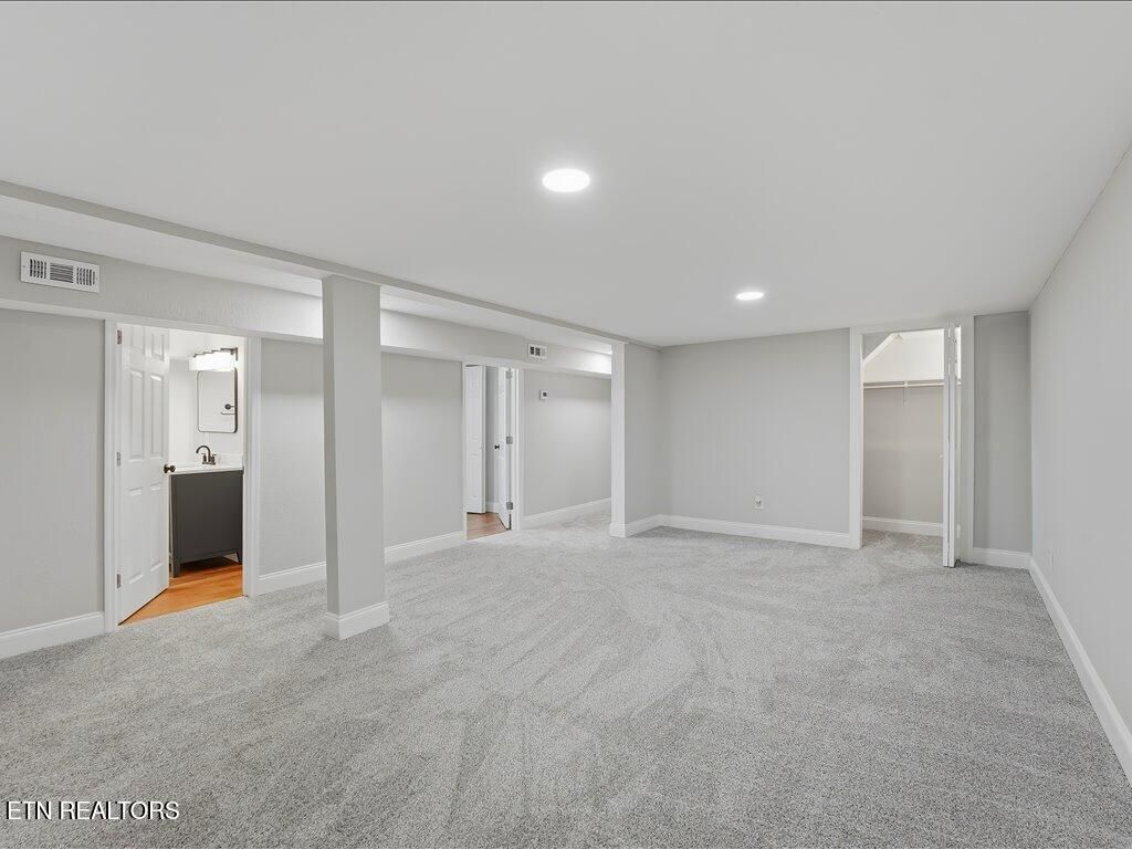 Now here's where it gets interesting -- the downstairs. The basement level is fully finished and set up in a way that gives you serious flexibility. There's a bedroom, a full bathroom, a bonus room, a den, and a kitchenette area complete with a sink, microwave, and pantry. It could be a teen suite, an in-law setup, a long-term guest space, or even a separate living arrangement for a family member who needs their own space without their own address. There's also a 300-square-foot garage on the lower level, which is great for storage, a workshop, or keeping a car tucked away.