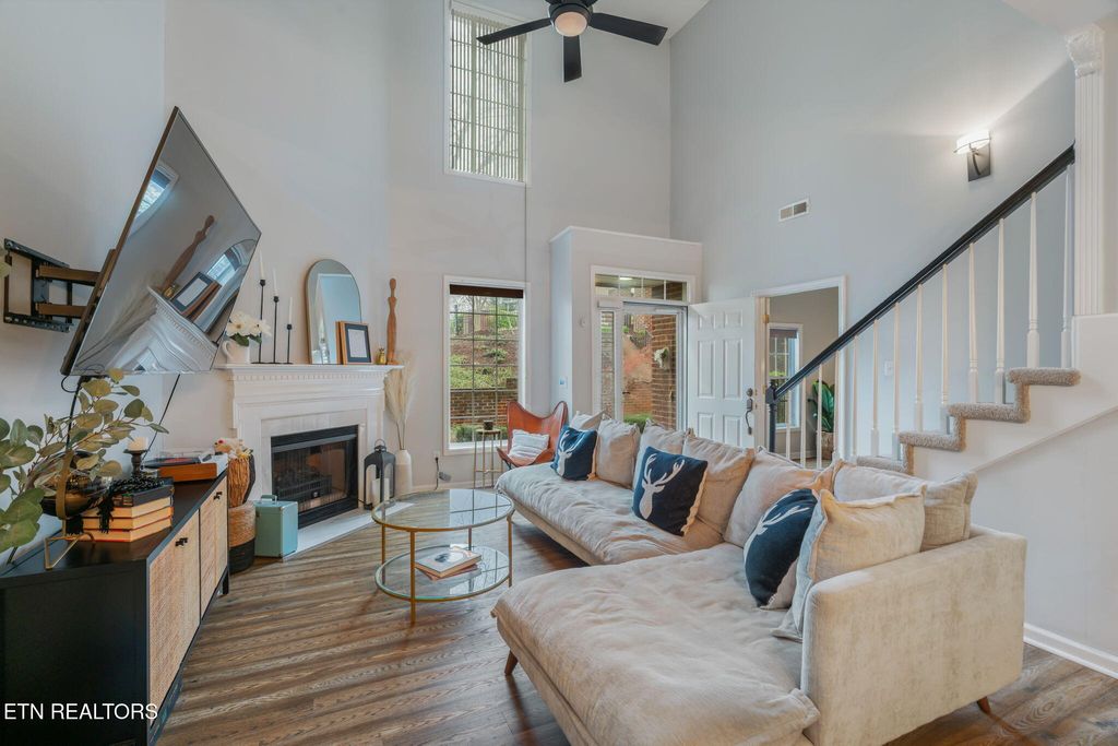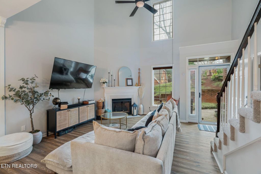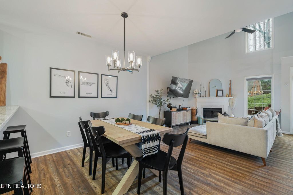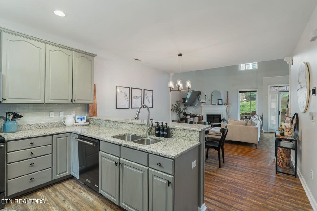 Featuring high ceilings and an open-concept layout, the light-filled family room boasts a cozy corner fireplace (electrical use only) while the updated kitchen offers granite countertops, and under-cabinet lighting with plenty of space to host and entertain.