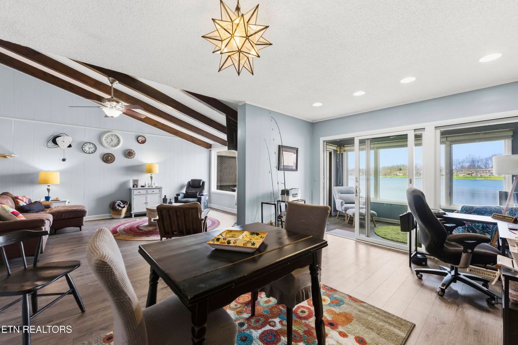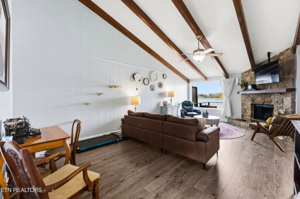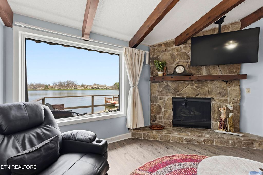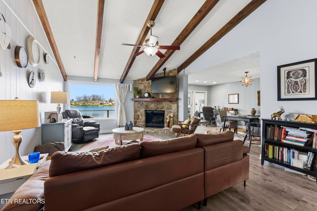 Step inside to find a spacious interior highlighted by a vaulted ceiling and a cozy stone gas fireplace, creating a warm and welcoming atmosphere. The open-concept layout connects the living area to the dining and kitchen area flowing onto the sunroom, enhancing your lakefront living experience.