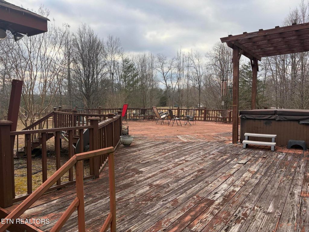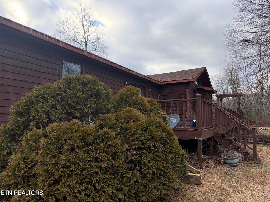Don't miss your opportunity for true peace and tranquility in Rhea County on nearby Dayton Mountain! Come claim the home you've been waiting for, this must have 3BR, 2BA offers 1600 square feet of living space tucked on 3.62 acres bordering an agricultural farm, complete with a 2 car attached garage, horse barn and only over one mile off hwy 30 off a private road, drive it til you run out of road to reach this private mountain oasis! Inside includes a striking vaulted wood ceiling with a rich natural finish, creating warmth and architectural character throughout the open concept floor plan with a stunning expansive picture windows and clerestory windows flood the space with natural lighting and frame serene outdoor views and Includes a stone wall fireplace and a many wood doors throughout, complete 2 ceiling fans and a chandelier. The kitchen offers a full Island and Oak cabinets, a built in breadbox and Lazy Susan (circular cabinet) with custom hardwood flooring in this space displays a diamond for the rare find it truly is. Kitchen and bathrooms have laminate flooring, the master sits overlooking the backyard and has French doors and master bath features additional cabinets and storage, another bathrooms sits between the 2 other bedrooms opposite the master bedroom. All Bedrooms are carpeted in hunter green. Laundry area is located inside hallway between the kitchen and has hardwood flooring just off the attached 2 car garage. It also features a 2 stall Horse Barn with a Tack Room and Feed Stall/Storage room. Large circular outdoor deck includes Hot tub and back deck leading up to the back patio to your own private bird viewing area from the master. Roof is 1-2 years old. Back deck needs some work and gutters re-installed, gutters on premises. Johne Deere lawn mower, washer/dryer and some wood furniture available