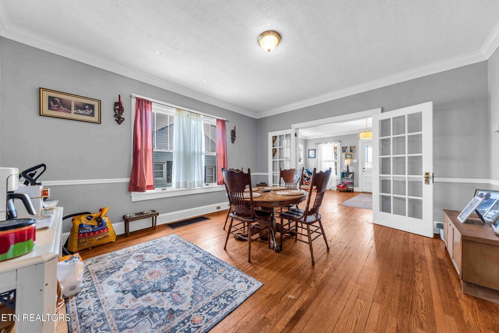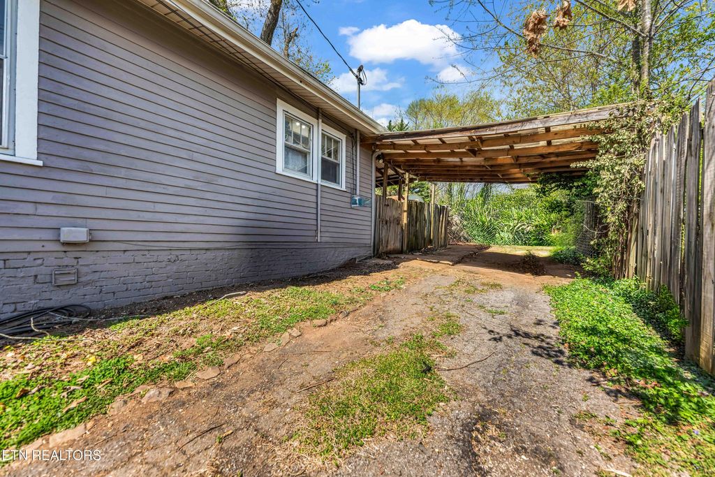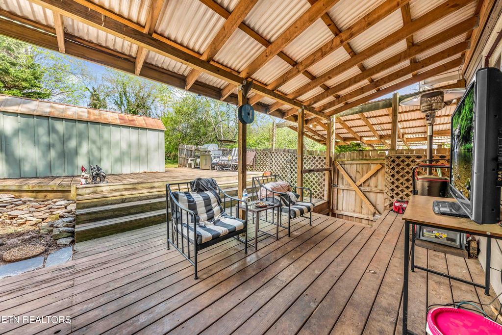 Charming Fountain City craftsman cottage featuring a covered front porch complete with a porch swing. Enter through the stained-glass front door into the spacious living room with a fireplace. Proceed through French doors to the formal dining area. The expansive kitchen boasts granite countertops, ample cabinetry, stainless steel appliances including a gas stove, and in-unit washer/dryer in a laundry closet. The hall bath features an antique claw foot tub with shower. The home has a spacious unfinished basement for extra storage. Through the backdoor you will find a beautiful covered deck overlooking a private back yard with privacy fencing. A storage building is just off the deck for additional storage for lawn equipment, etc. Covered carport on driveway. A new roof was installed in 2023, It feels like home when you walk in the door!