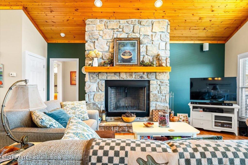With approximately 4,144 square feet, this home feels substantial, well built, and wonderfully designed for both everyday comfort and hosting a crowd. The main level features a warm and inviting great room with cathedral wood ceilings, true hardwood floors, a dedicated dining area, and a striking stone wood-burning fireplace. The kitchen is equally welcoming with Corian countertops, stainless appliances, an electric range, a large island with seating, and two pantry closets nearby. Also on the main level are two lake-view bedroom suites--each with oversized closets and walk-in showers--plus a half bath and a laundry room complete with icemaker for easy lake-day entertaining.