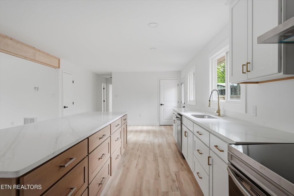 Experience effortless single-level living in this stunning, fully remodeled home where top-tier craftsmanship meets high-end design. The open-concept interior is filled with natural light, showcasing premium finishes like the durable, light-toned wood-look LVP flooring that flows throughout. At the heart of the home is a massive kitchen featuring custom white cabinetry, elegant gold fixtures, and brand-new stainless steel appliances, all centered around an oversized island built for entertaining.