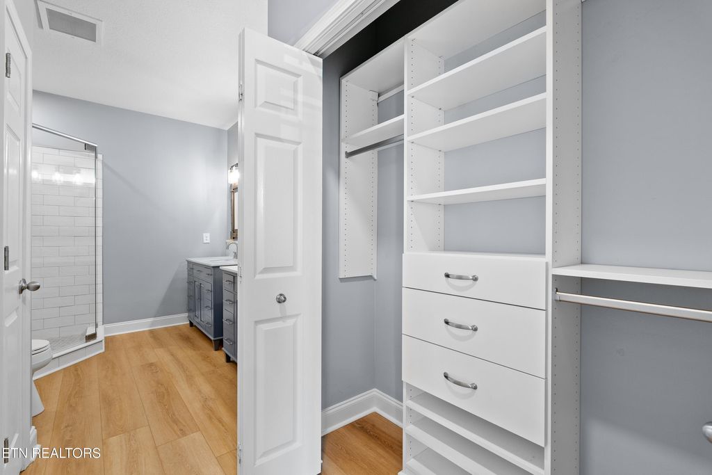 The spacious primary suite includes two custom closets and a fully updated bathroom with quartz countertops, dual vanities, custom cabinetry, and a beautifully tiled walk-in shower. Additional bedrooms also feature custom closet systems, providing excellent storage throughout.