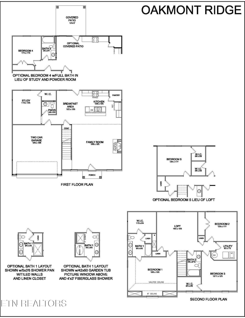 The Oakmont Ridge, part of the Trend Collection by Ball Homes, is a spacious two-story plan with up to five bedrooms possible. A first-floor study can also be configured as a bedroom and full bath option. The large family room is open to the kitchen which makes this plan ideal for entertaining. Kitchen features include an island design, sunny breakfast area, lots of cabinet space, and a walk-in corner pantry. The upstairs primary bedroom suite has a vaulted ceiling and a spacious bath with linen closet, double bowl vanity, and tub/shower combination. An optional layout with garden tub and separate shower is also offered. Two additional upstairs bedrooms, utility room, and a large loft for gathering complete the second floor. The loft can also be configured as a fifth bedroom. Exterior features include a hip roof design and covered front entry. Build to suit, for comps only