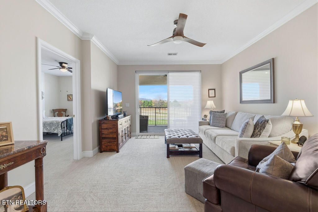 The living room flows effortlessly to the covered porch, creating the perfect space to relax and take in views of the golf course and tranquil water feature.