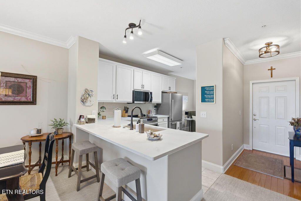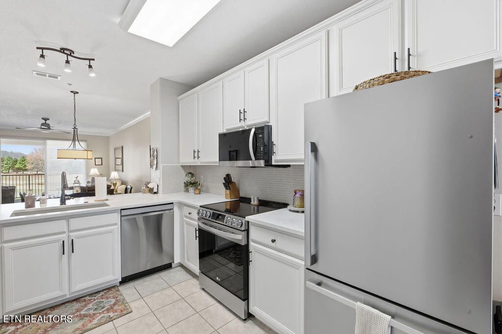 The fully renovated kitchen features a bright, inviting color palette, newer stainless steel appliances, ample cabinetry, and a functional layout that opens seamlessly to the dining area and living room. Enjoy additional seating at the breakfast bar, perfect for casual meals or entertaining.