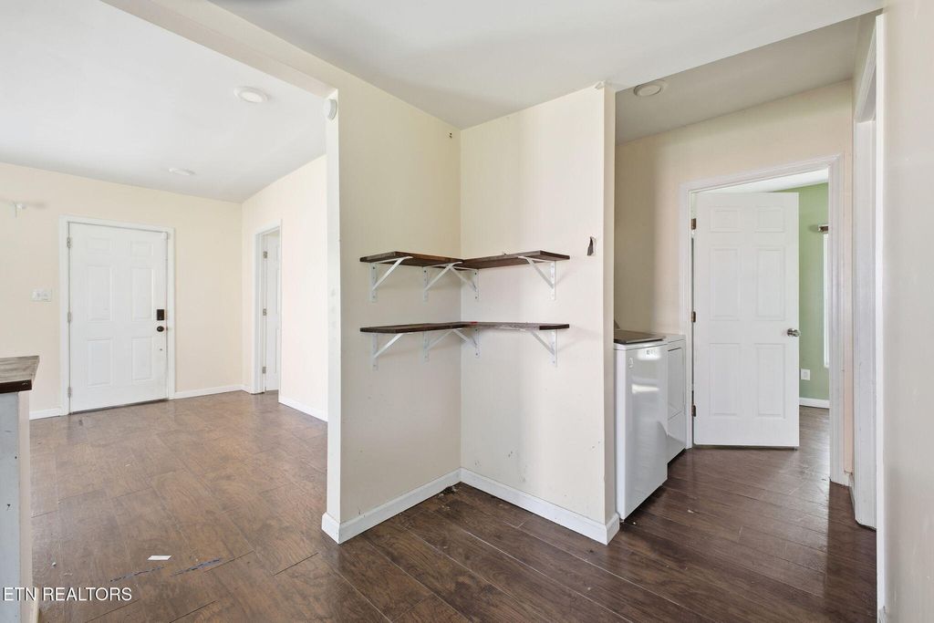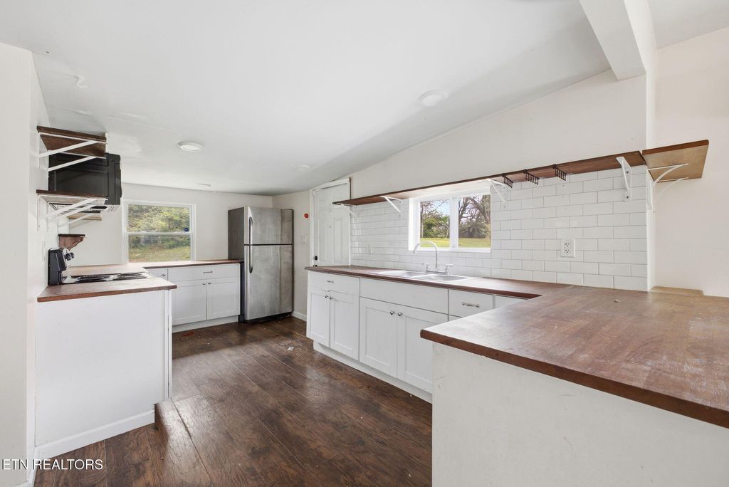 Inside, the home has a bright, open feel with easy-flow living space and plenty of natural light. The kitchen is a major highlight, offering more room and counter space than you typically expect, along with white cabinetry, subway tile, and built-in open shelving that adds both character and function. It is the kind of kitchen that feels practical for everyday living while still giving the home personality.