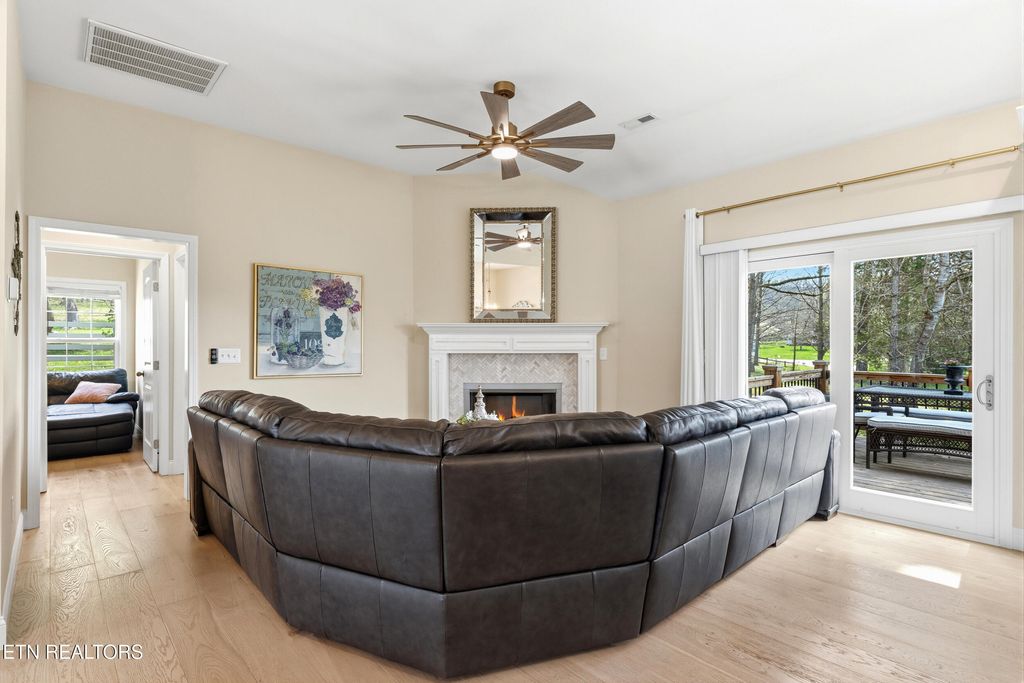 The kitchen, dining, and living areas are thoughtfully connected, creating a space that feels open while still comfortable and well-defined. The kitchen features granite countertops, a large island, pantry, stainless steel appliances, and ample cabinetry, along with a well-designed hood vent that adds a distinctive touch. The space opens to the family room and dining area, where a gas fireplace with mantel and tile surround and an abundance of windows bring in natural light and offer tranquil views of the surrounding setting, creating a peaceful backdrop.