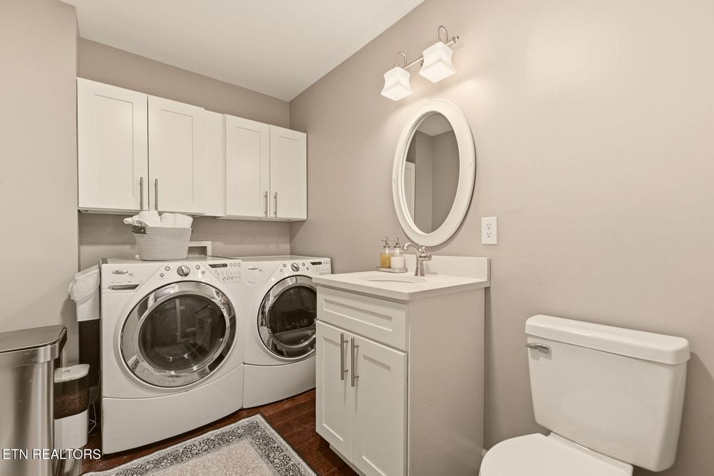 A traditional formal dining room on the main level is currently styled as a home office, offering flexibility for today's evolving lifestyle needs. Nearby, the mudroom and dedicated laundry room include added cabinetry for storage, while a conveniently located half bath provides ease for guests.