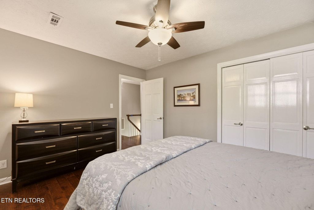 Upstairs, the split bedroom layout provides separation between the primary suite and two additional bedrooms. The spacious primary suite features a beautifully remodeled bathroom and custom walk-in closet designed for both organization and ease. The secondary bedrooms are generously sized and include custom closet systems, sharing a full bathroom with a walk-in tiled shower and clean, modern finishes.