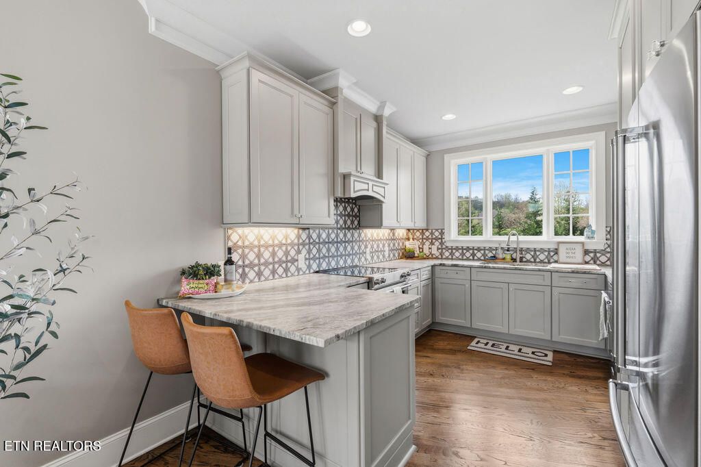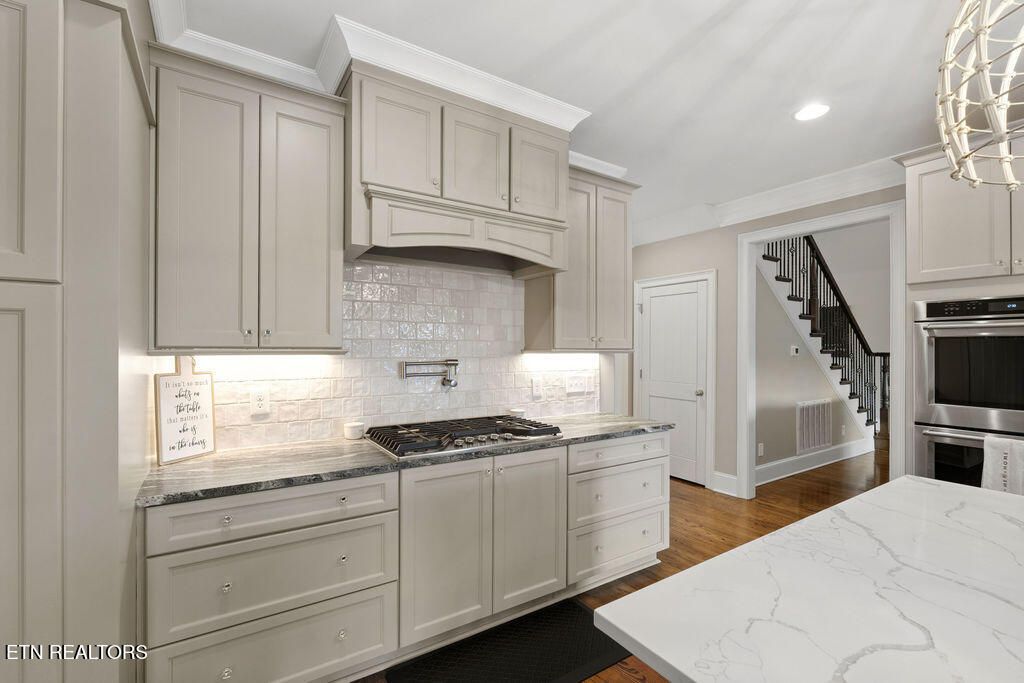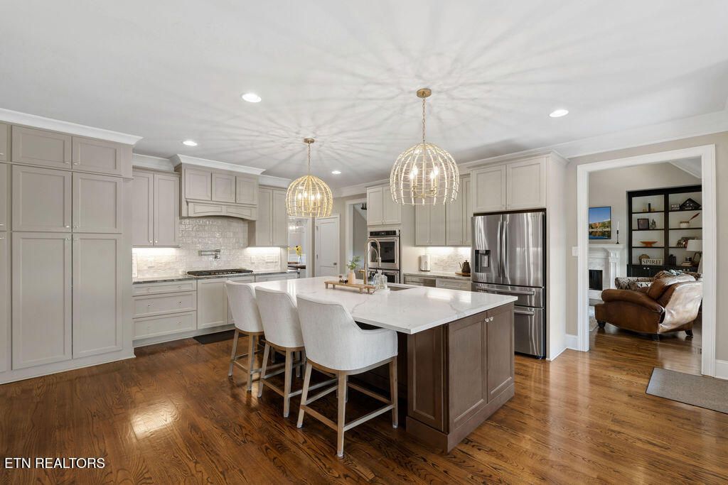 No details were spared in this homes remodel and the high-end neutral finishes make this home attractive for most buyers. This home lets in an abundance of natural light with all the main level windows having new custom shades and drapery, beautiful hardwood floors, spacious gourmet kitchen with extra large island and sink, formal dining area & spacious office. The chefs entertaining kitchen is one most dream of with its double ovens, gas stove with pot filler above, wine fridge, ice maker, ample cabinet/pantry space with pull out organized drawers. There is also a cozy sitting area/eat in space with a fireplace off the kitchen to allow company to feel right at home.