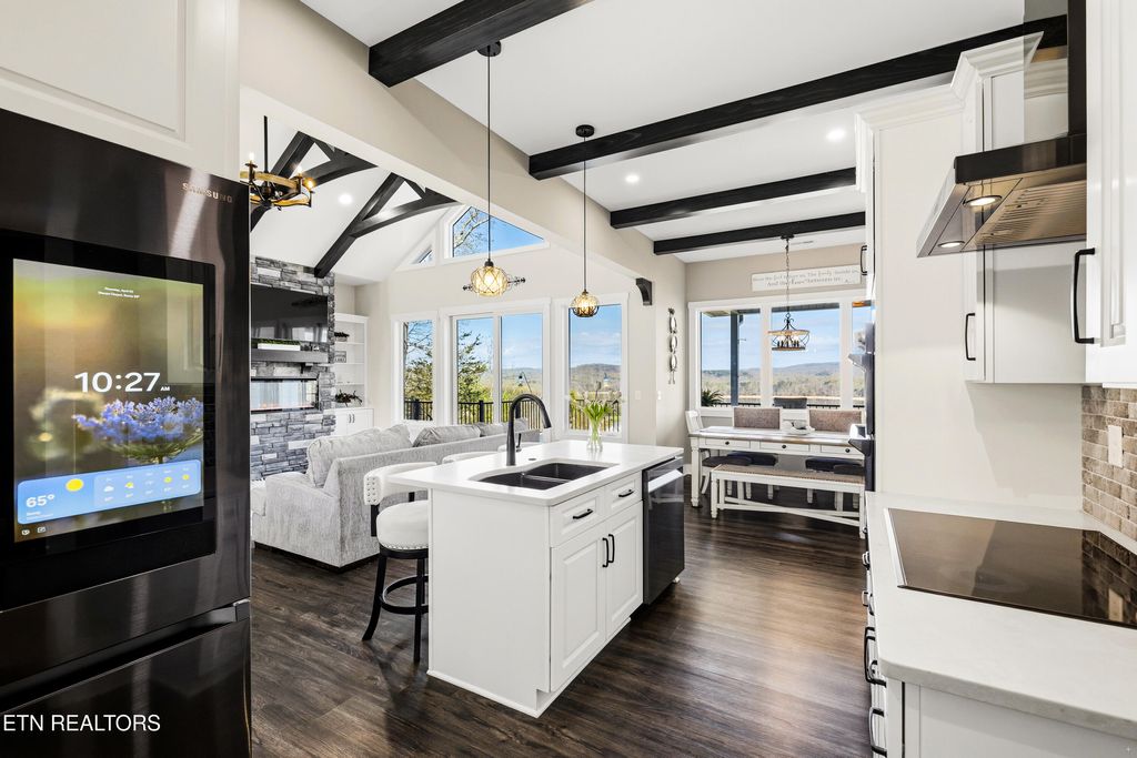 Inside, the home is thoughtfully designed for both relaxed living and seamless entertaining. Expansive picture windows flood the space with natural light while framing the lake at every turn. The kitchen features quartz countertops, upgraded Samsung appliances, and flows seamlessly into open concept living spaces accented by custom beams and a modern fireplace. The primary suite and two additional bedrooms are conveniently located on the main level.