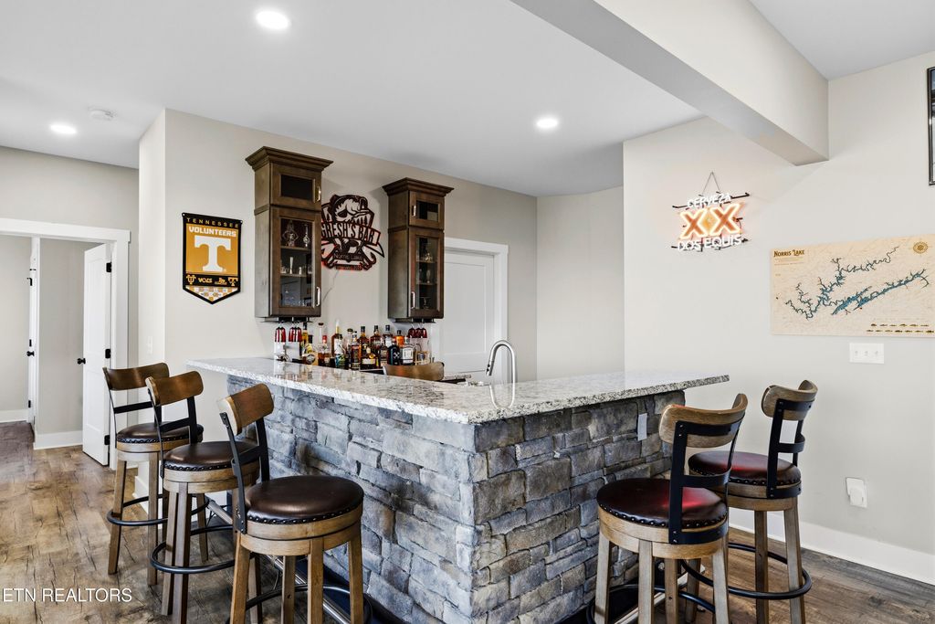The lower level is built for entertaining, featuring a theater room, two-sided fireplace, two additional bedrooms, full bath, custom bar with ample seating, beverage cooler, pantry, and generous space to host with ease.