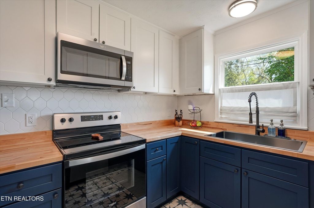 Step inside to find beautiful hardwood floors throughout the main living areas, complemented by heated farmhouse-style tile floors in the kitchen and bathroom. The home features fresh paint and stylish new light fixtures, creating a clean, modern feel. The kitchen is a standout with soft-close cabinetry, butcher block countertops, and stainless steel appliances--perfect for everyday living and entertaining.