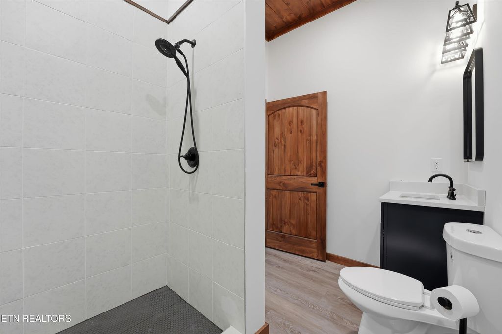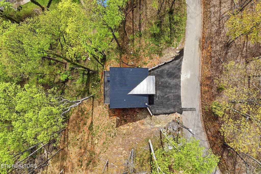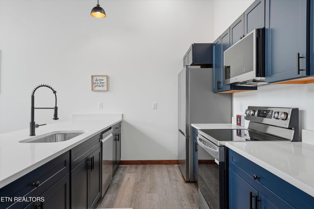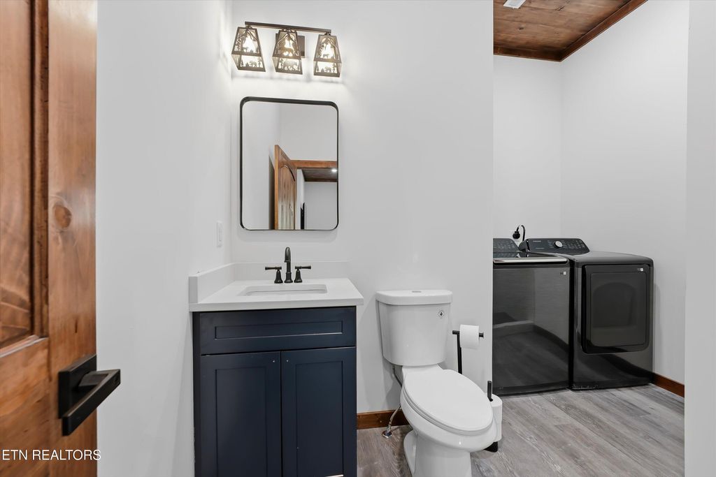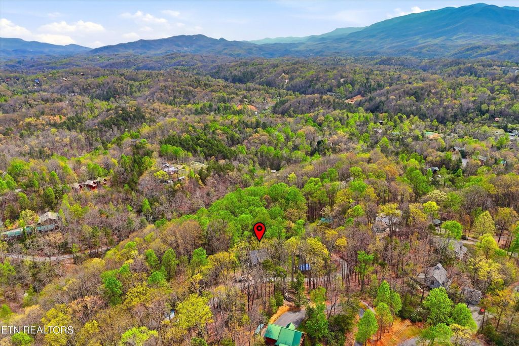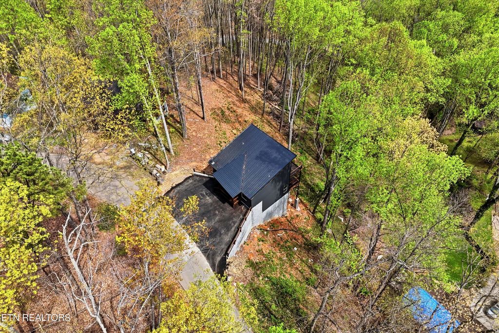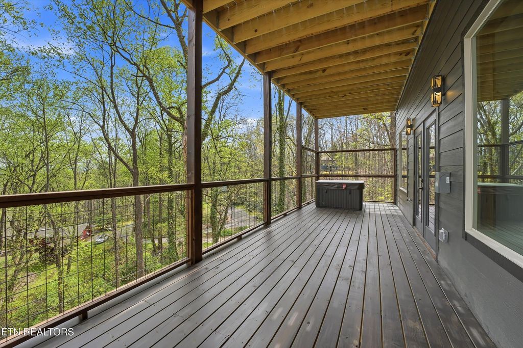 Perfectly situated in a prime Gatlinburg location, this brand-new cabin blends modern style with stunning views - an ideal opportunity for an income-producing overnight rental or personal mountain retreat. The open living space, framed by vaulted wooden ceilings and expansive windows, is designed to keep the scenery front and center. Luxury vinyl flooring flows into a chic kitchen featuring bold blue cabinetry, bright white countertops, and stainless steel appliances. Just off the dedicated dining area, French doors open to a wide deck - perfect for guests to relax and take in the fresh mountain air.
