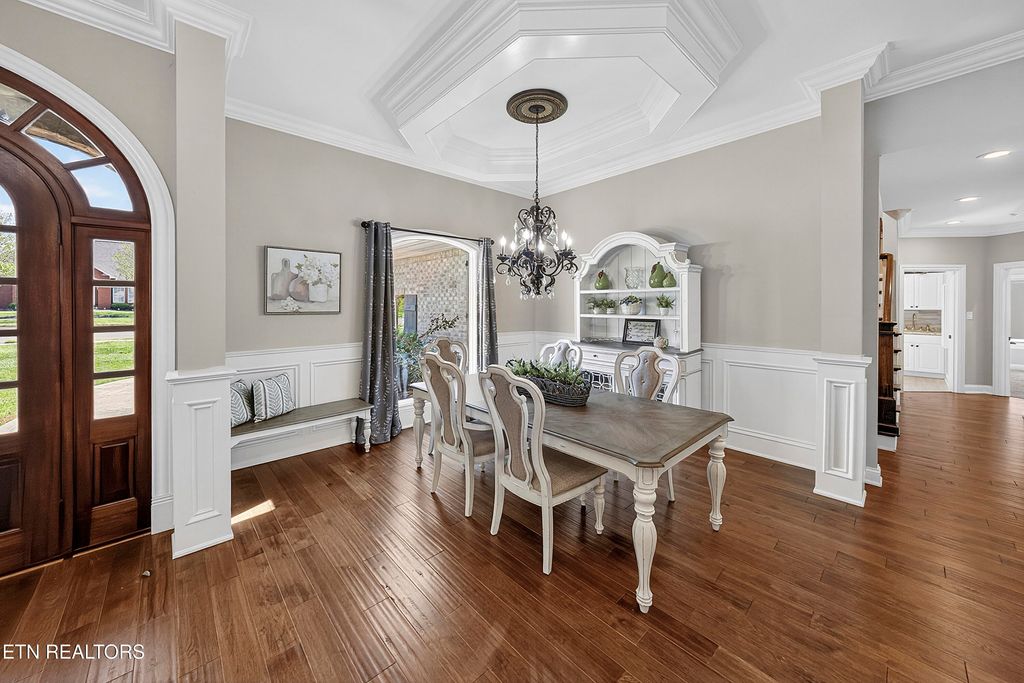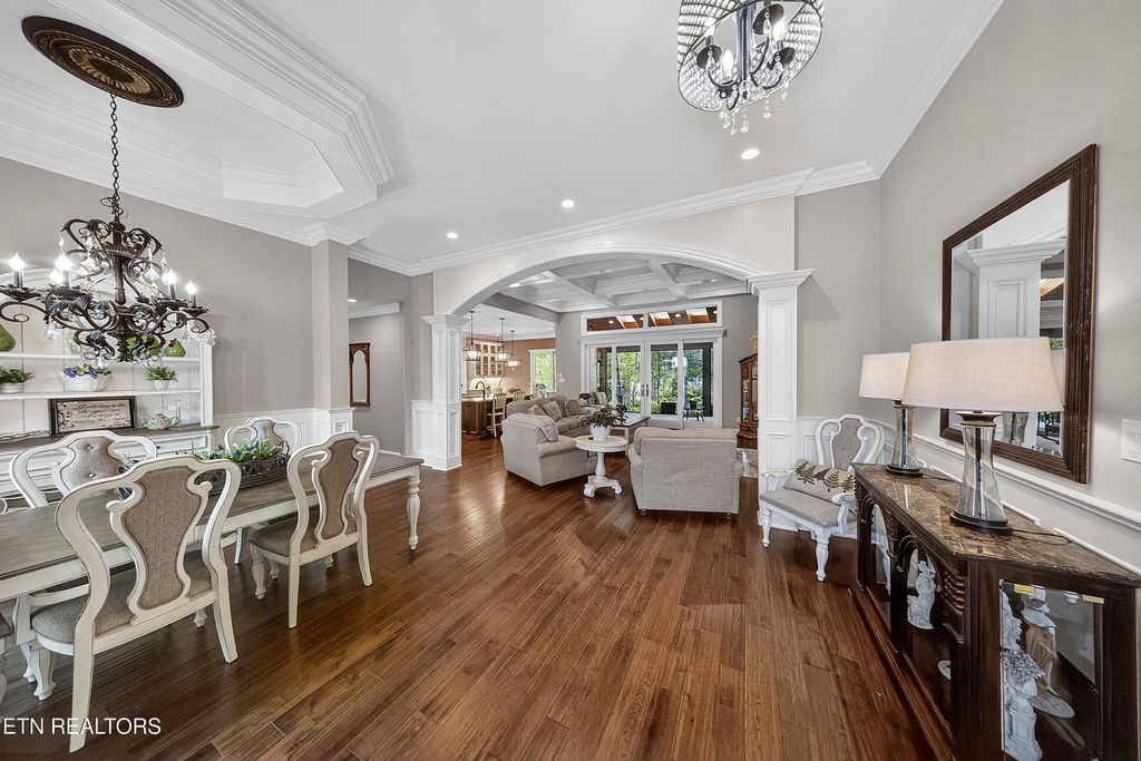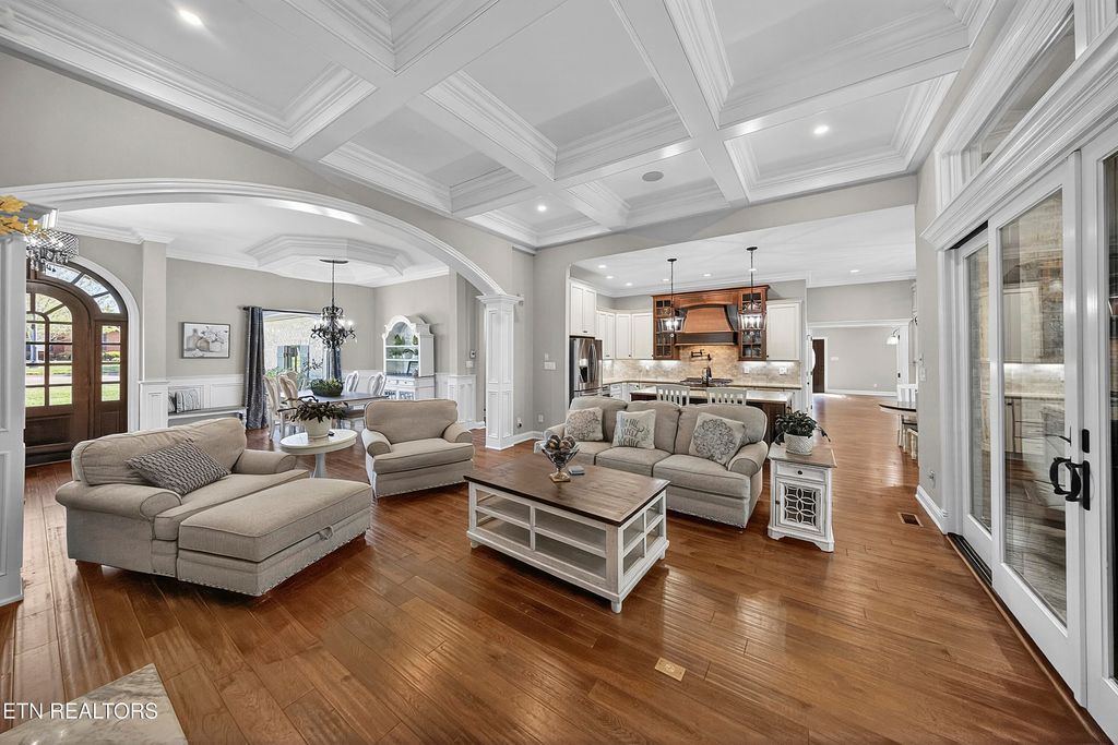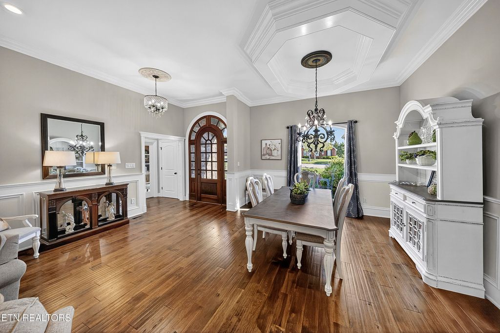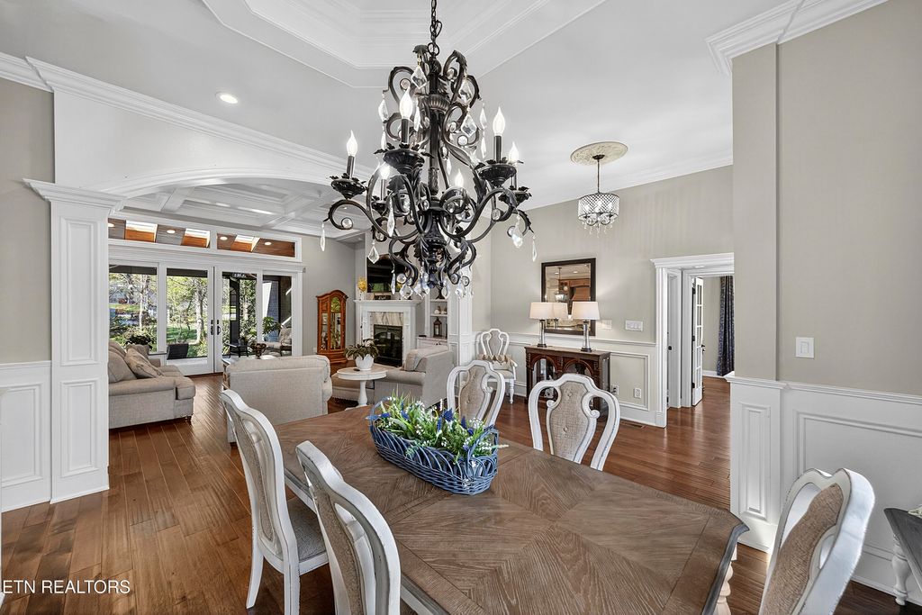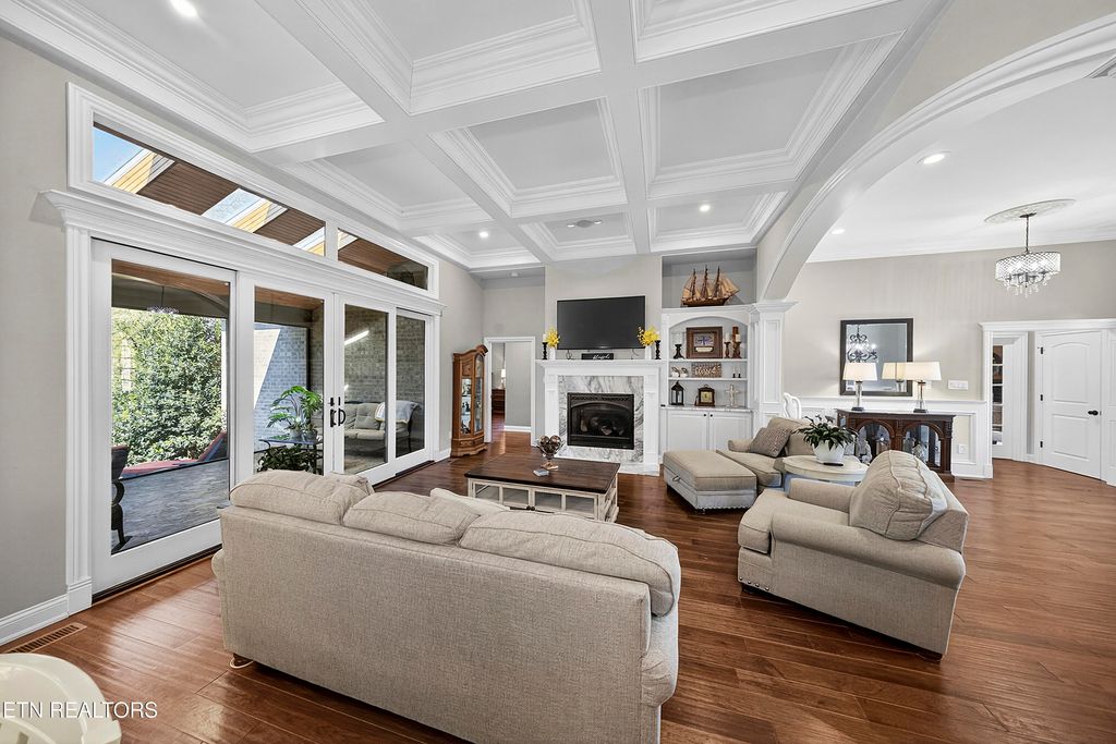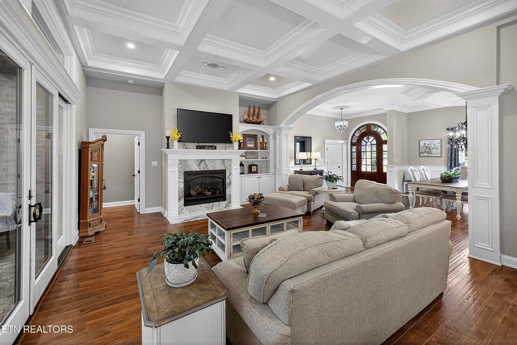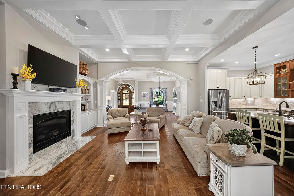 Upon entering you are immediately impressed by the open, airy, grand living and dining areas that welcome you with soaring coffered and tray ceilings, rich hardwood floors, exquisite millwork including 8'' crown molding and classic wainscoting, marble fireplace, built-in book shelves, and abundant natural light that enhances every meticulously curated detail.