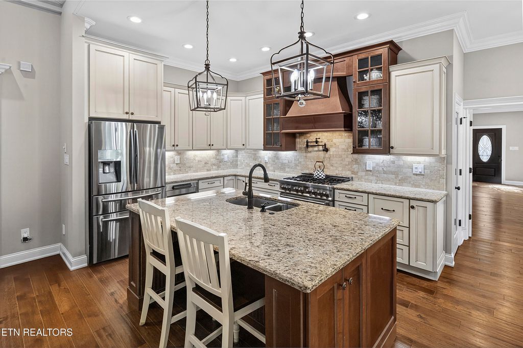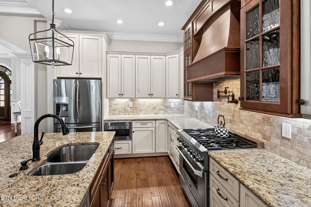 The gourmet kitchen is a chef's dream, appointed with high-end appliances, custom cabinetry, handsome custom range hood, granite countertops, walk in pantry, and an expansive island perfect for entertaining. The kitchen flows seamlessly into the grand living and dining areas, providing a layout that is ideal for both intimate gatherings and large-scale entertaining.