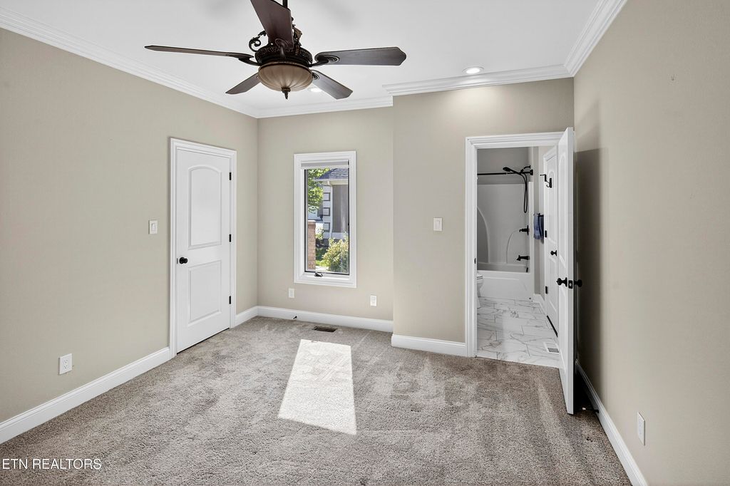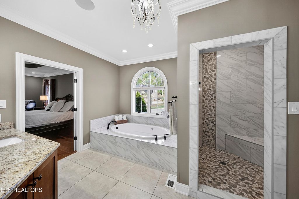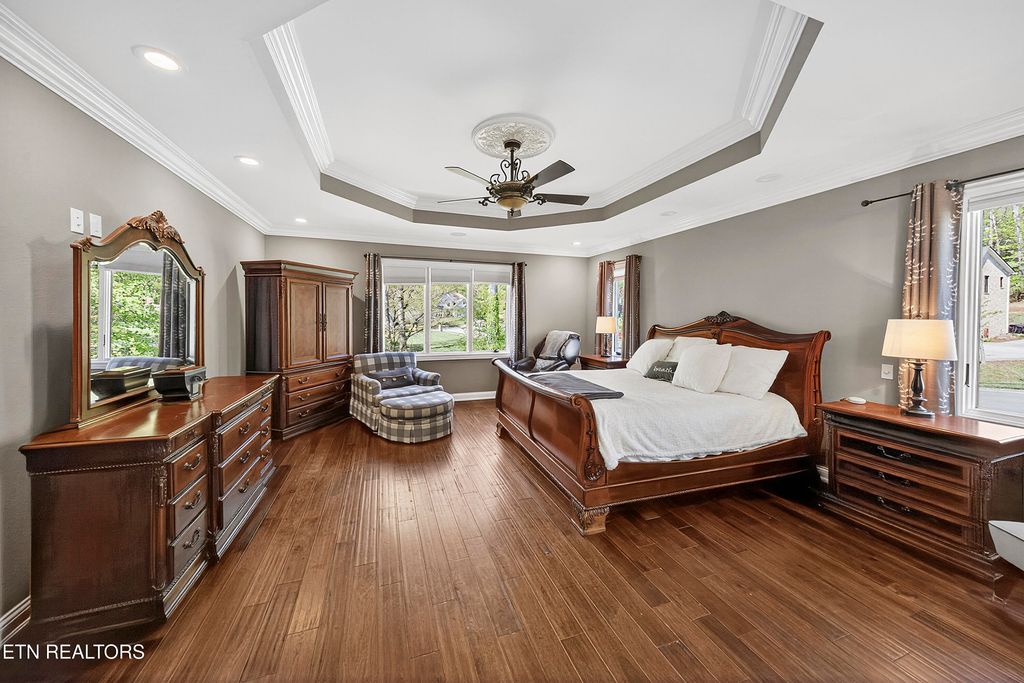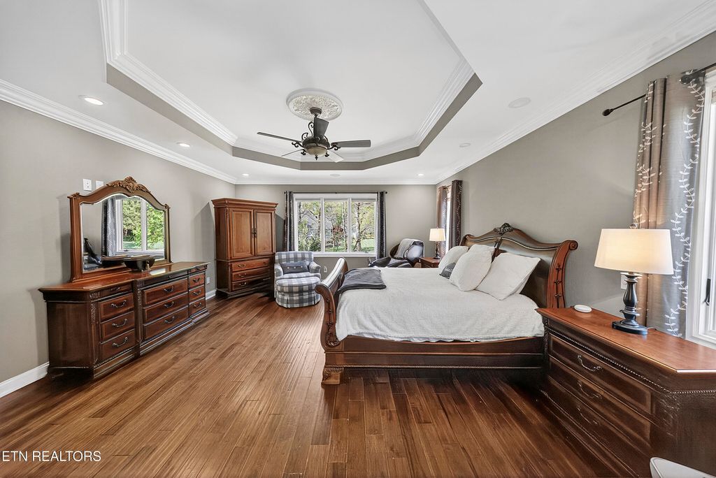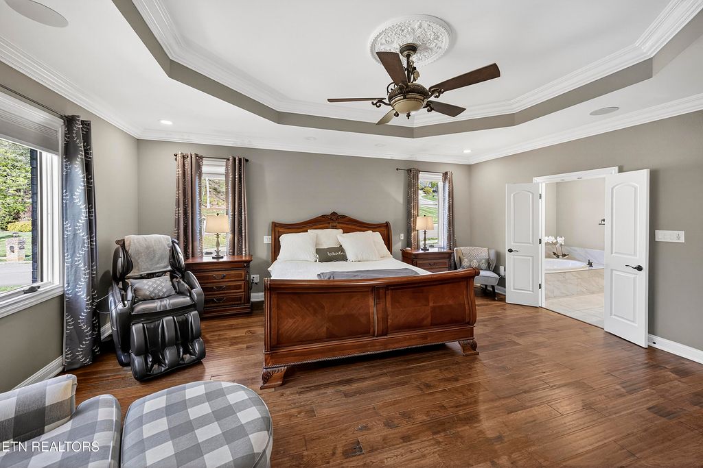 Retreat to the expansive and bright main level primary suite with tray ceiling and en suite complete with double vanity, garden tub, walk-in shower, and generous closet space.