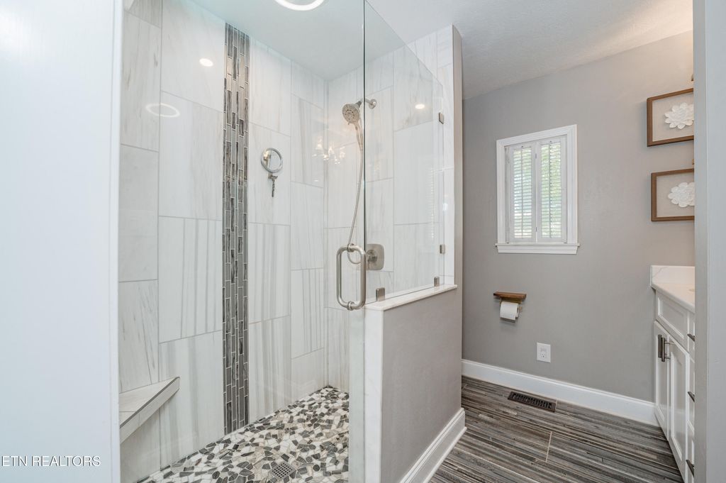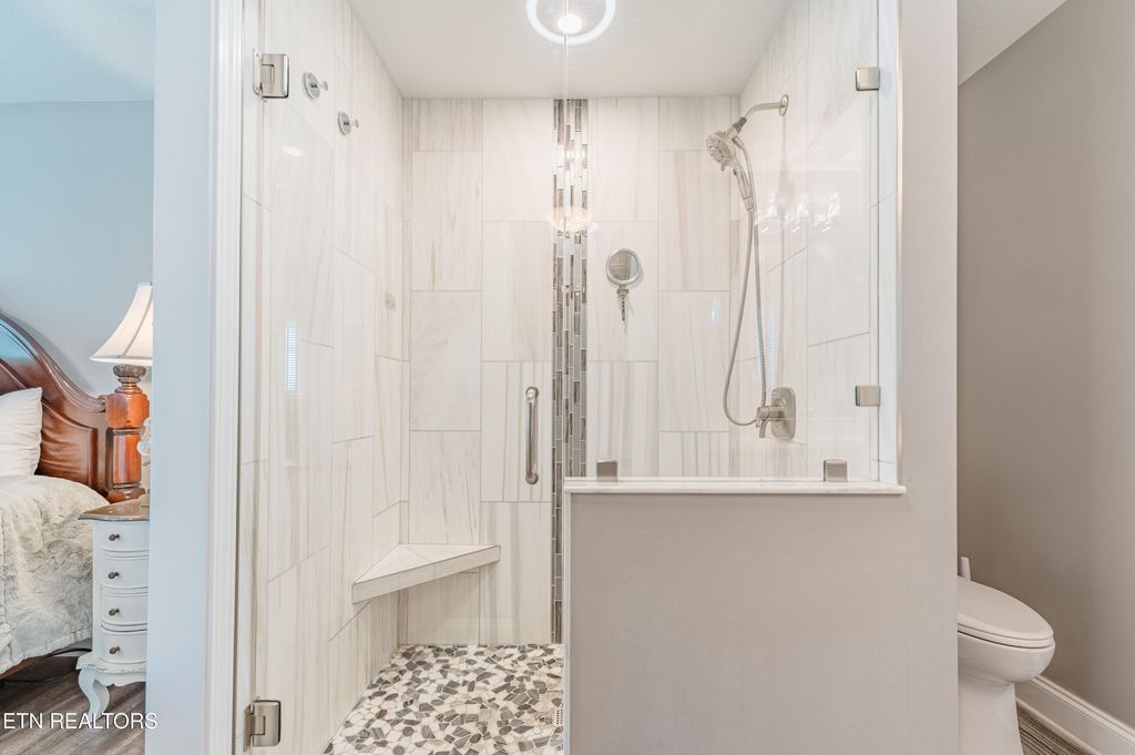 The primary bathroom features a custom tile shower, and the layout comfortably accommodates family and guests.