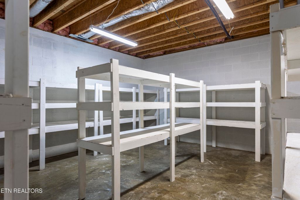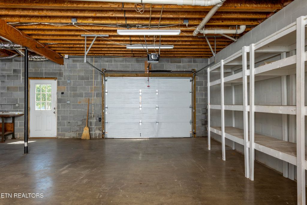 The Ultimate Lake Basement & Outdoor Oasis makes the lower level is a hobbyist's dream. It includes a deep-bay garage--perfect for your boat, golf cart, or lake toys--alongside a workshop area with built-in shelving, a half bath, and a finished storage room for seasonal items and dry goods.