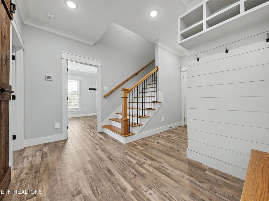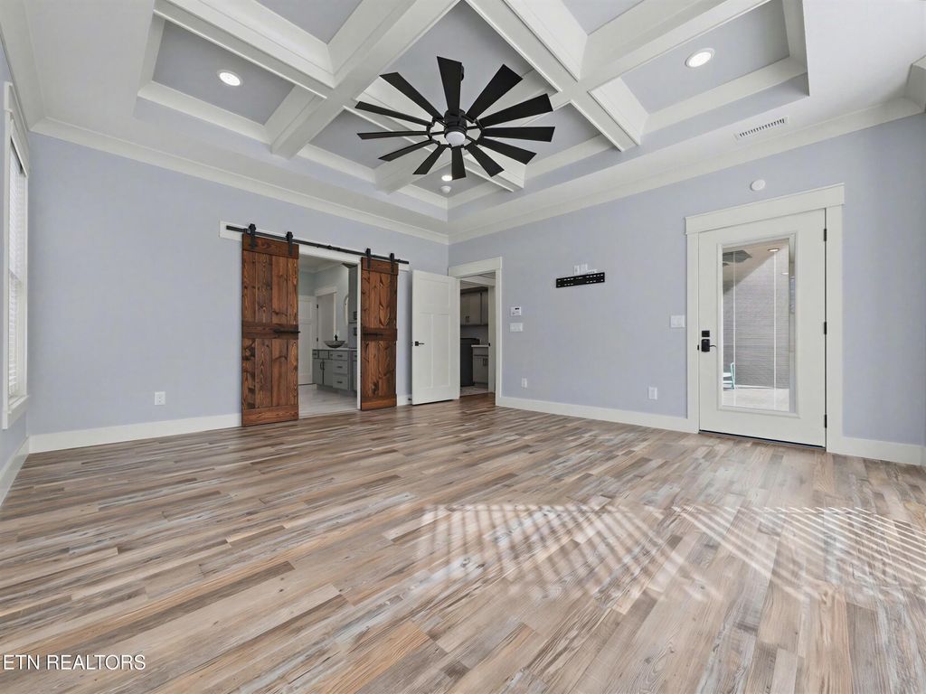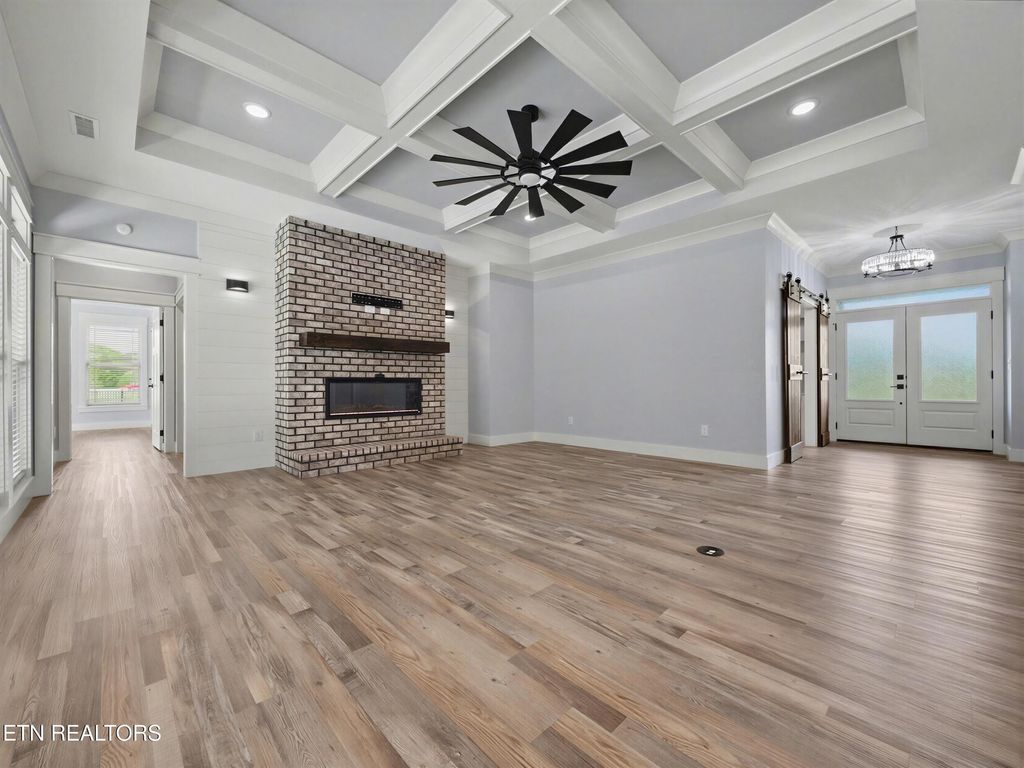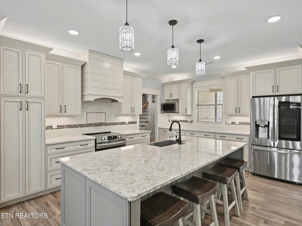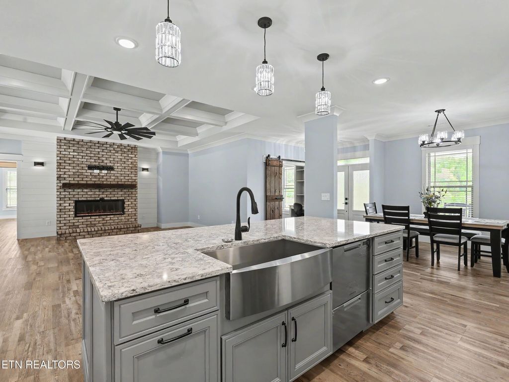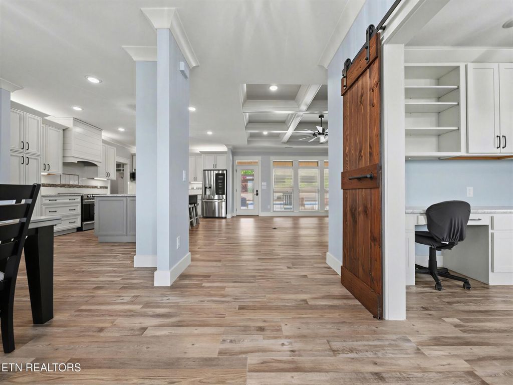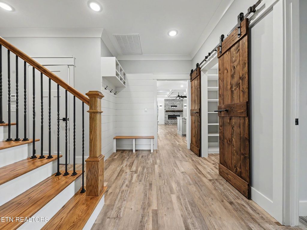 The chef's kitchen is both functional and visually stunning, featuring custom cabinetry, an oversized island with seating, premium stainless steel appliances, granite countertops, farmhouse sink, tile backsplash, two pantries, and a seamless flow into the dining area. Cosmetic highlights include custom barn doors, sconces, shiplap accents, and luxury vinyl plank flooring.