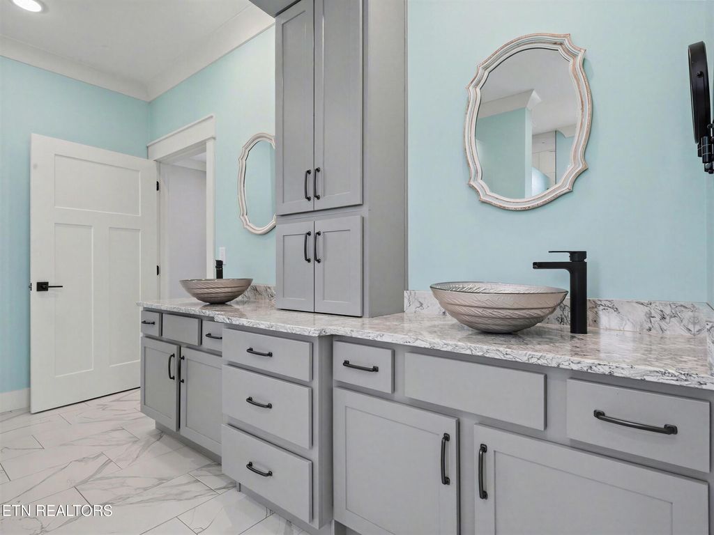 The generously sized primary suite is designed with both luxury and practicality in mind. With coffered ceilings, natural light, and direct access to the covered patio overlooking the pool, this space serves as the perfect retreat! The spa-inspired en-suite bathroom features an open layout with double vanity, vessel sinks, and an oversized walk-in tile shower. One of the standout features is the expansive walk-in closet, providing ample organizational space and natural light.